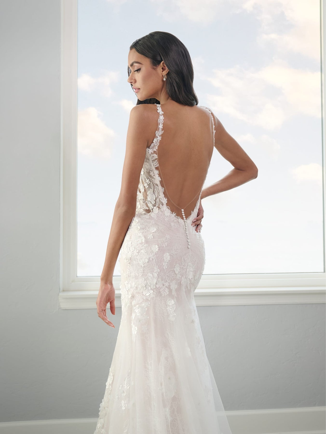 Receive lots of compliments in this lace applique long sleeveless illusion wedding dress with a fitted skirt by Adrianna Papell 31304. This sultry, slim gown is made of tulle and lace with a die cut lace appliqué that trails from the neckline to the hem. The sheer bodice wraps around the sides to open to a sexy low back. The back skirt is made of layers of tulle.