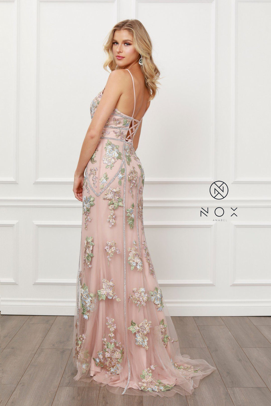 Look picture-perfect in this beaded floral applique long deep V-neck dress with fitted skirt by Nox Anabel G478.