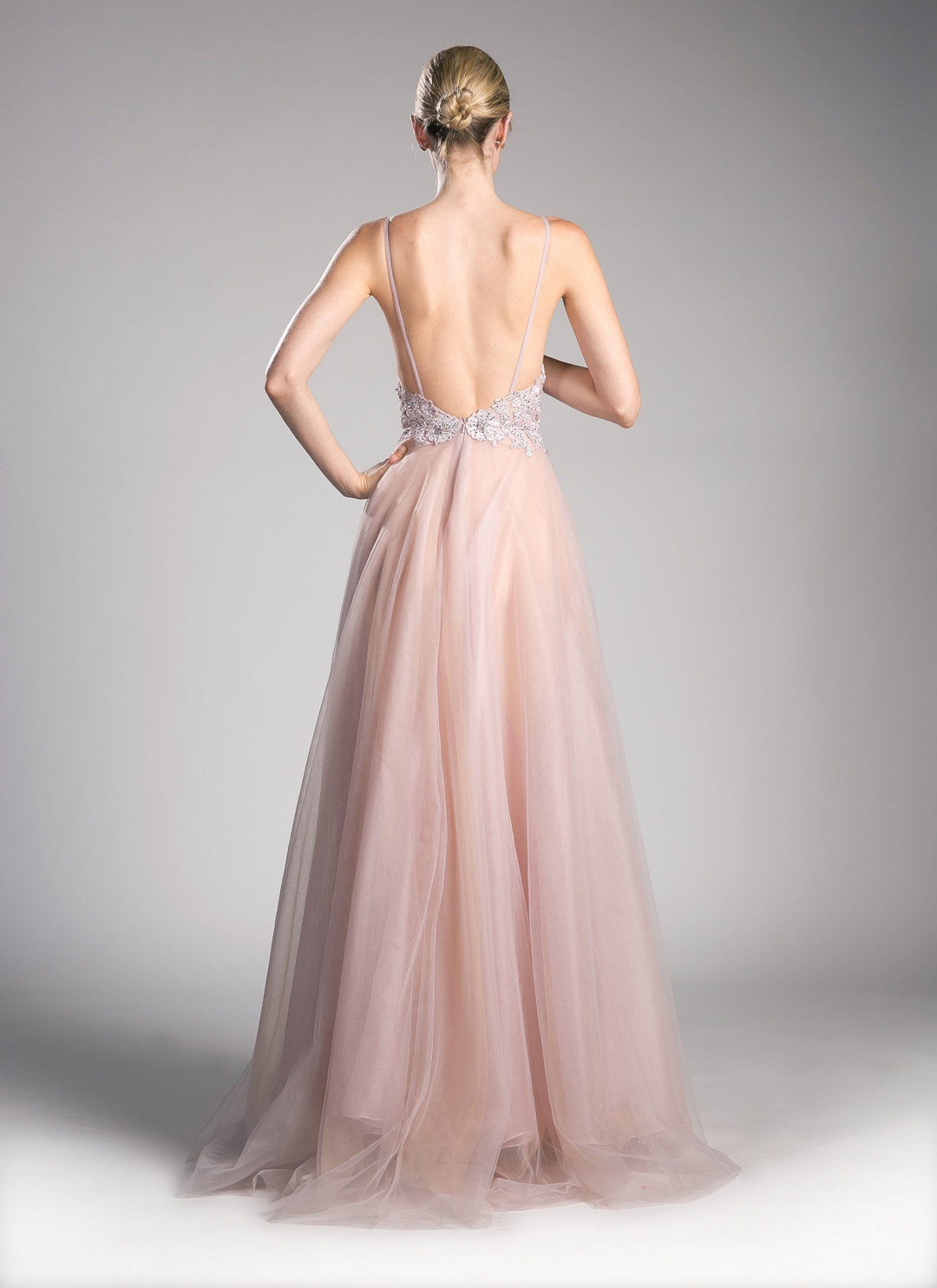 Leave the crowd breathless in this long V-neck dress with appliqued bodice by Cinderella Divine UW203. This evening gown features a sheer V-neck sleeveless spaghetti strap bodice adorned with dazzling beaded floral lace appliques that cascades to the top of the skirt, deep open back, a floor length sheer A-line skirt with mini skirt underneath, and a zipper closure.