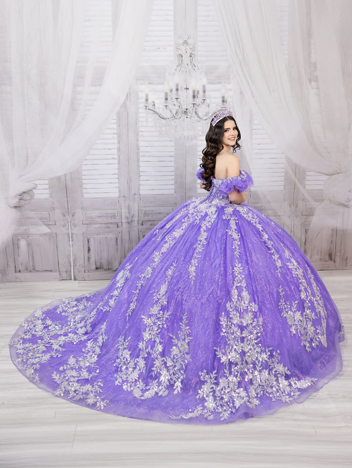 Be the center of attention in this embellished long sweetheart corset dress with an A-line skirt by LizLuo Fiesta 56534. This traditional Quinceanera gown is the perfect choice for your special day. The sheer, corseted bodice is covered in sparkling floral lace appliqué. The double ruffle off-the-shoulder detachable sleeves add excitement to this classic look. The glittery full ball gown skirt features all-over lace placements to create a stunning moment.