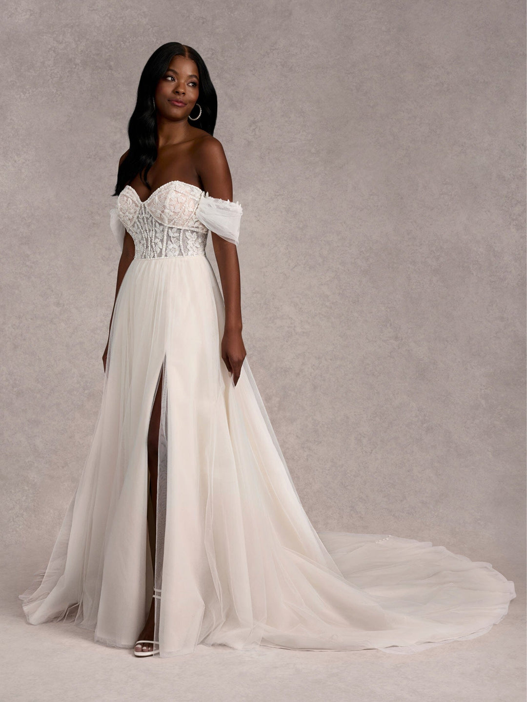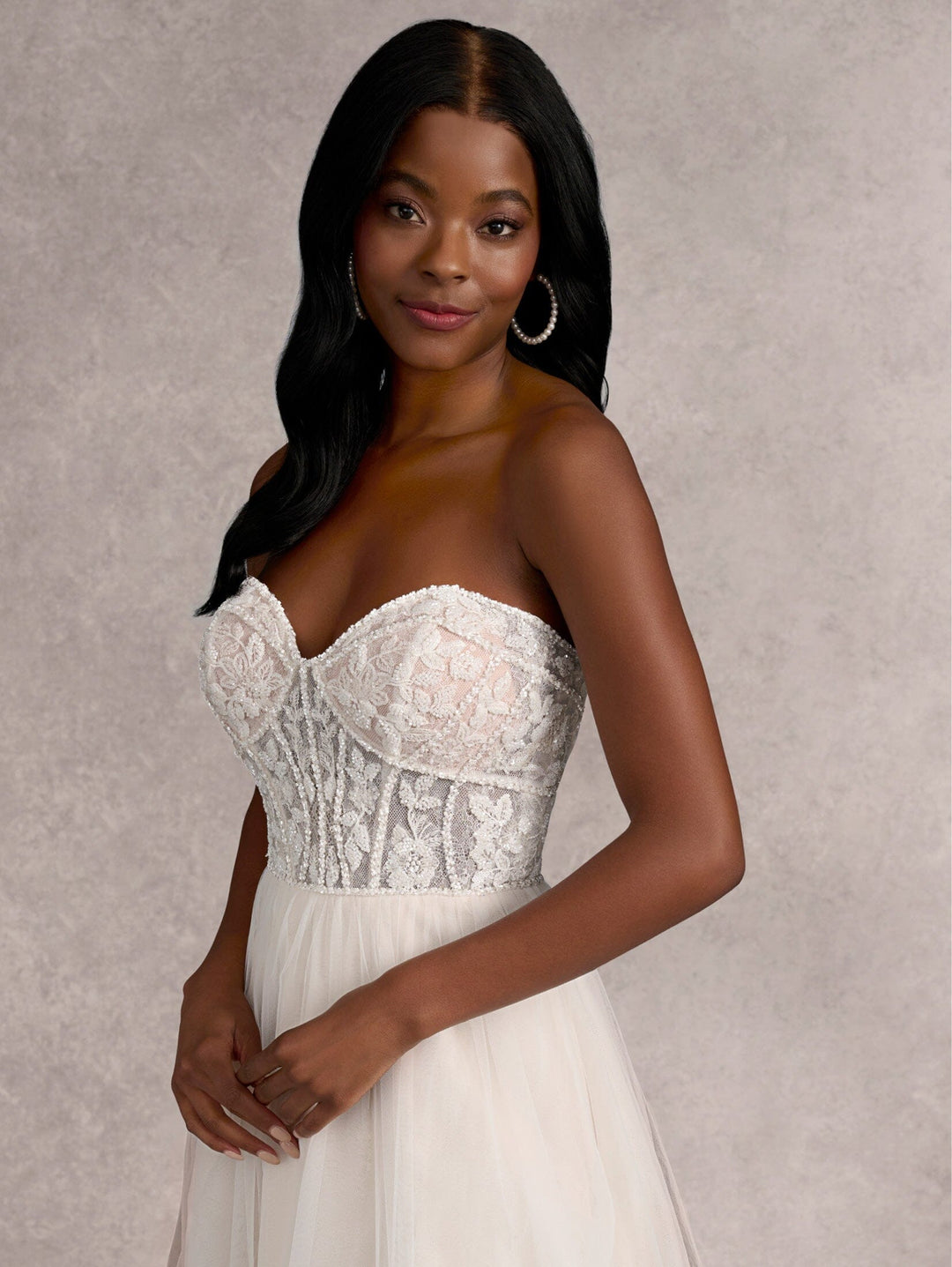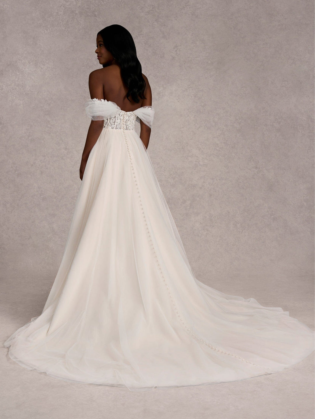 Full of romance with a dreamy soft A-line silhouette and sweetheart neckline. The semi-sheer bodice is beaded over lace and features beaded body contoured lines with placed floral motifs. The fantasy continues with detachable draped off-the-shoulder straps, covered buttons down the back, a front slit and layers of tulle with a sweeping train.