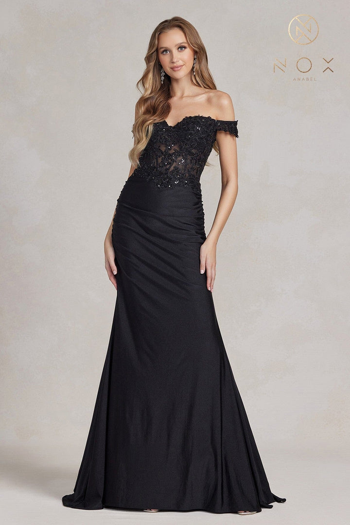 - Embroidered Fitted Off Shoulder Gown by Nox Anabel E1184