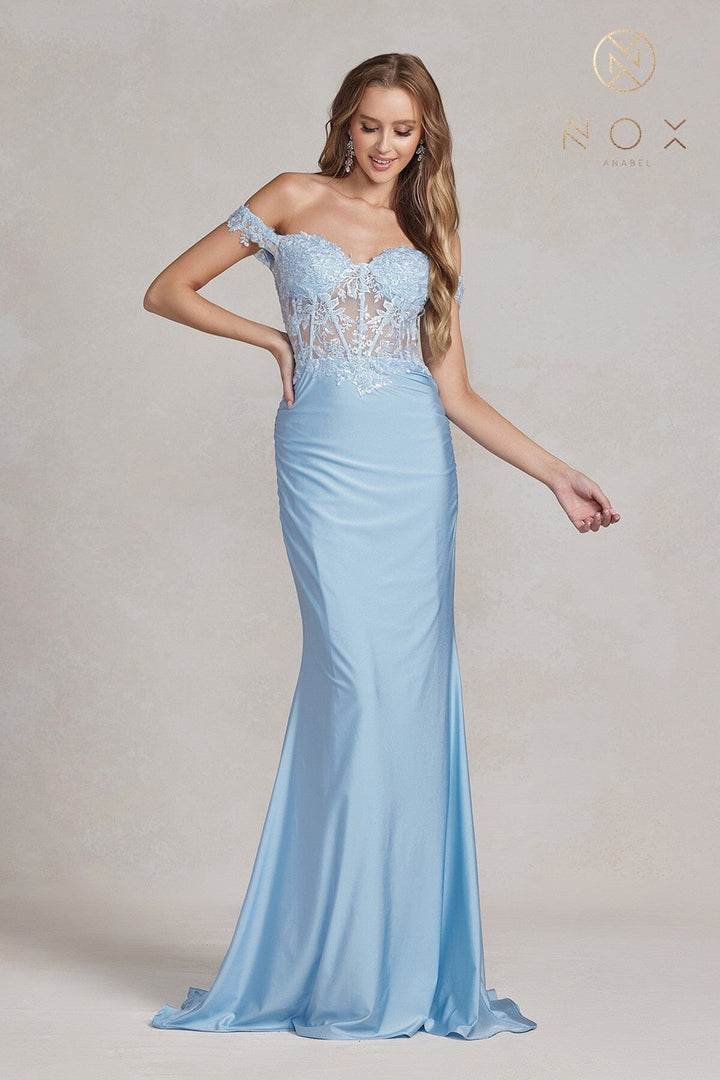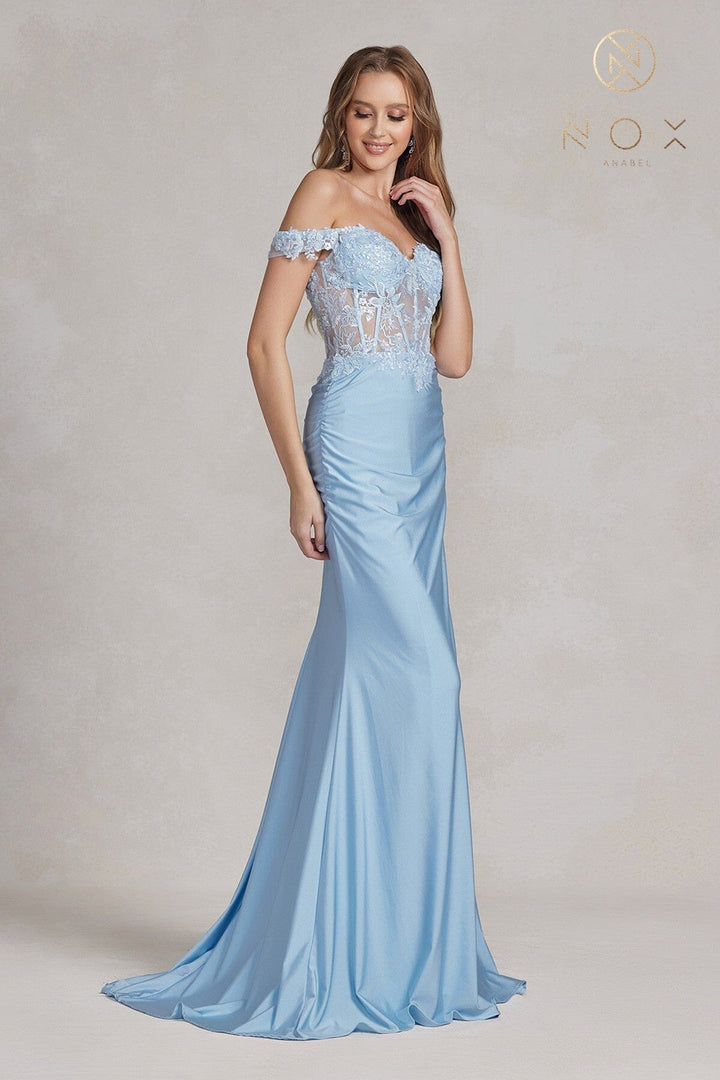 Look breathtaking in this bead embroidered long off the shoulder corset dress with fitted skirt by Nox Anabel E1184.