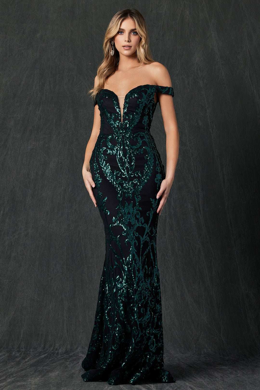 - Fitted Off Shoulder Sequin Print Gown by Juliet