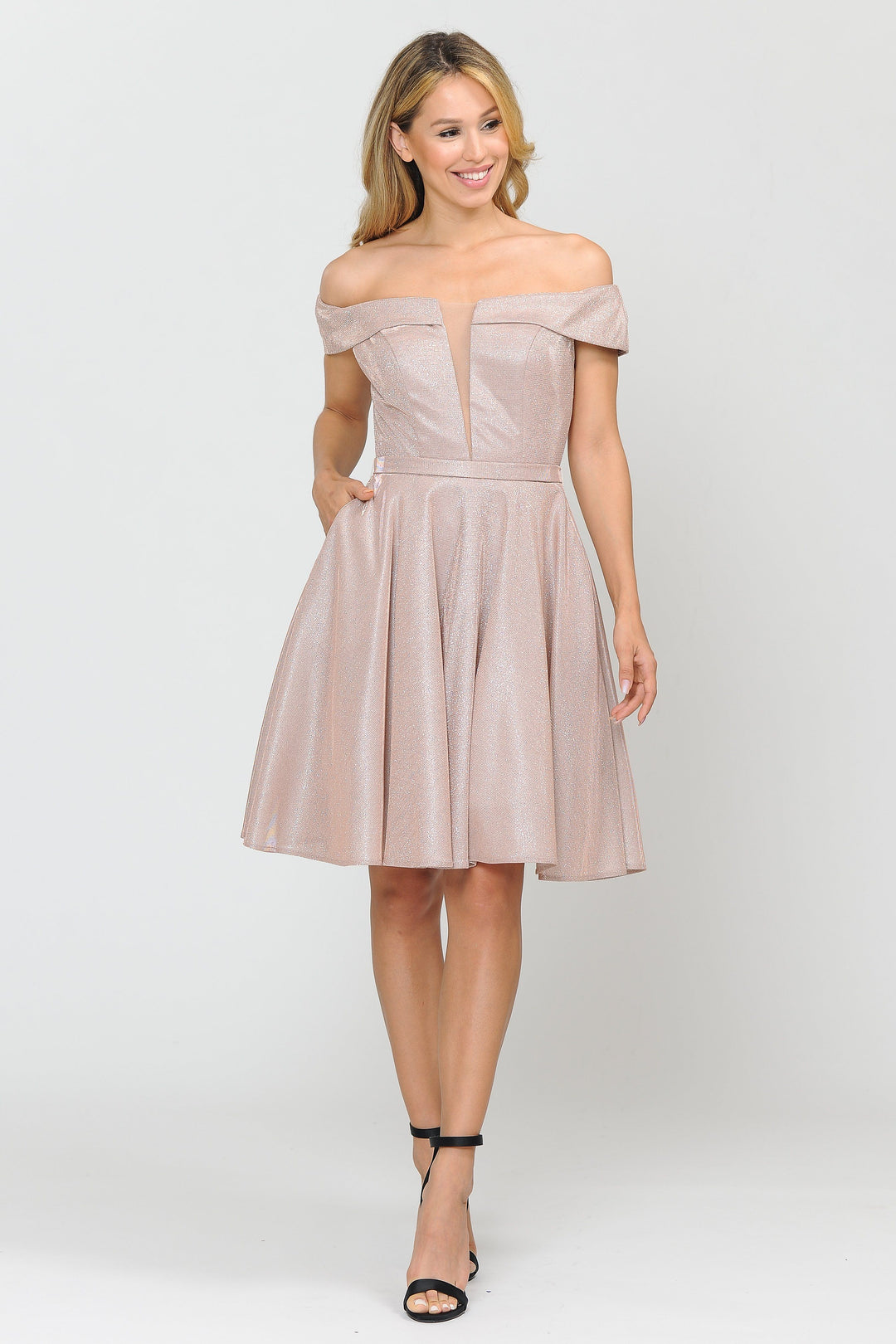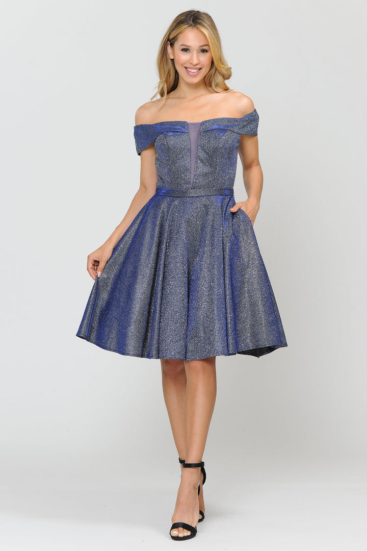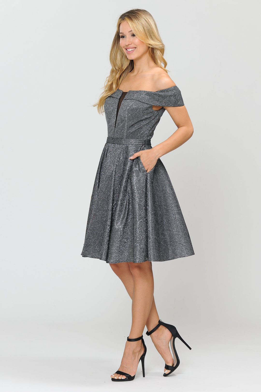 Light up the room in this off shoulder metallic glitter cocktail dress with front illusion cutout by Poly USA 8224. This beautiful short off shoulder dress features a deep V-neckline with sheer cutout, side pockets, open back, short A-line skirt, and a zipper closure.