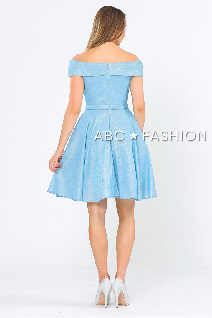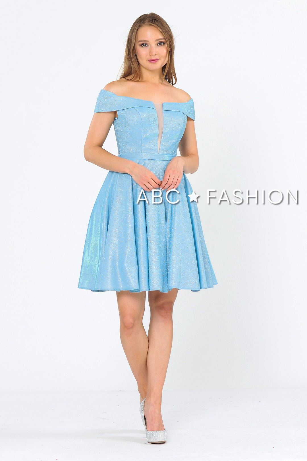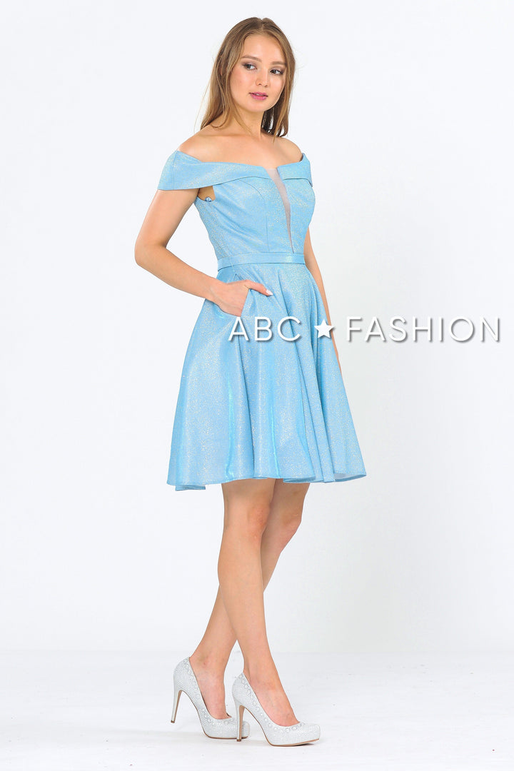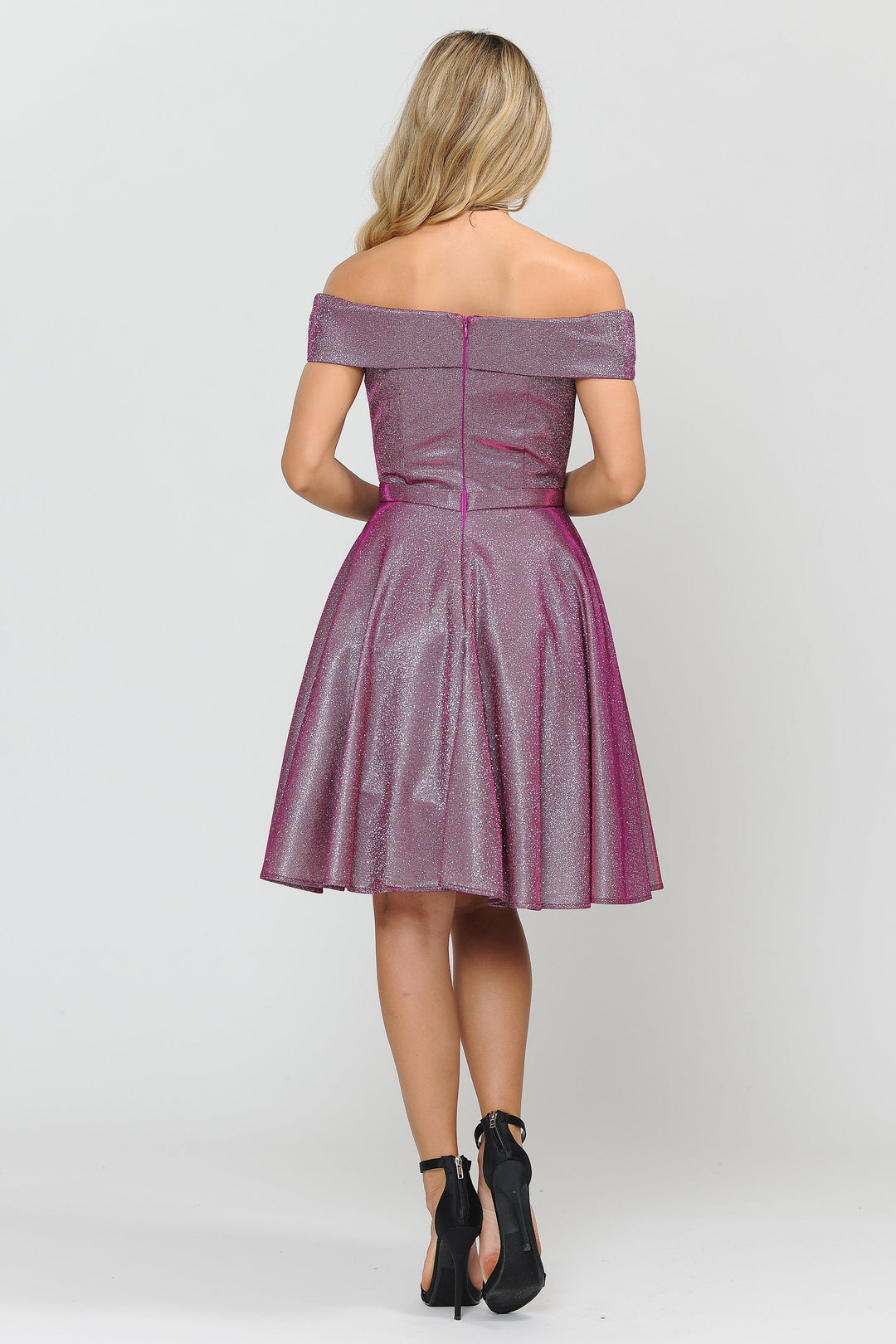 Light up the room in this off shoulder metallic glitter cocktail dress with front illusion cutout by Poly USA 8224. This beautiful short off shoulder dress features a deep V-neckline with sheer cutout, side pockets, open back, short A-line skirt, and a zipper closure.