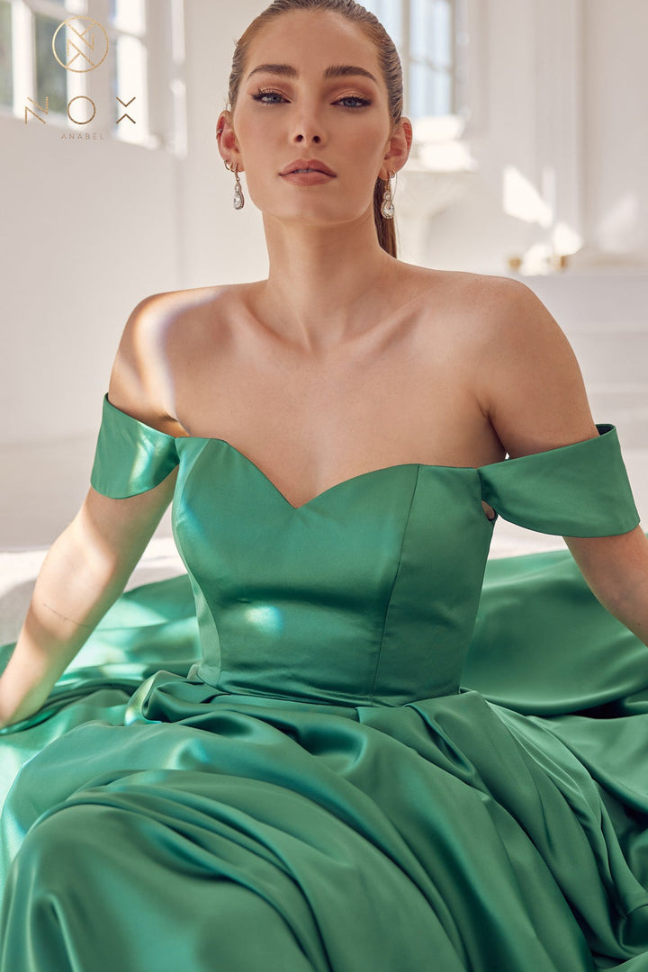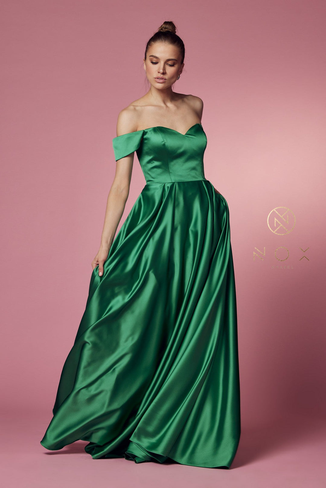 - Off Shoulder Satin Pocket Gown by Nox Anabel R1032