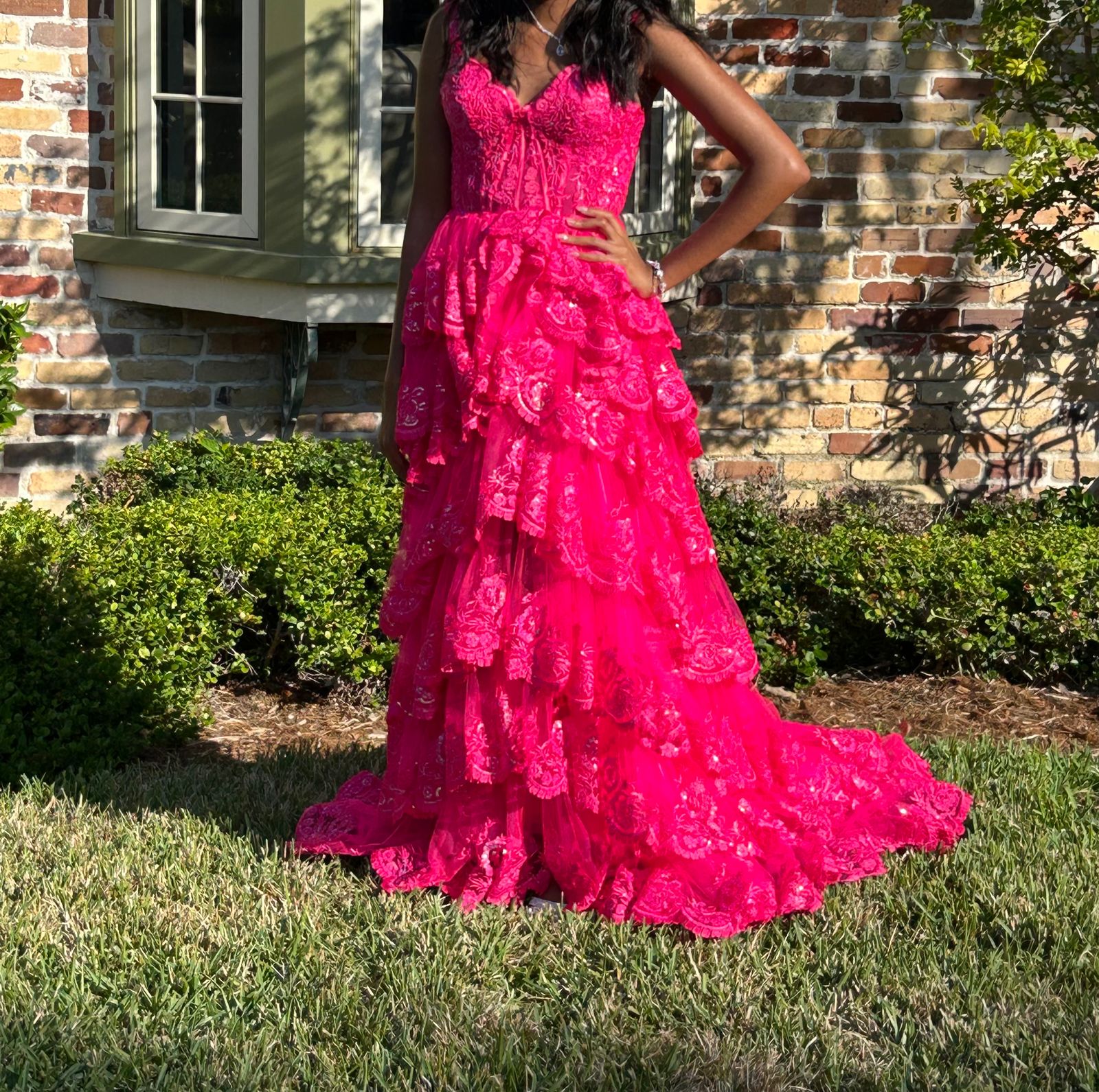 I brought this dress for my daughter’s senior prom. She looked stunning with silver bedazzled platform heals and accessories. My only complaint was it was pain not to have something to attach to your arm when dancing. The train was a a bit too long and she is 5’8 . This dress indeed was well made with exceptional quality and the shipping was fast . The way the dress arrived to my home shows upmost care. I will definitely another dress from ABC. ❤️🌹🌹