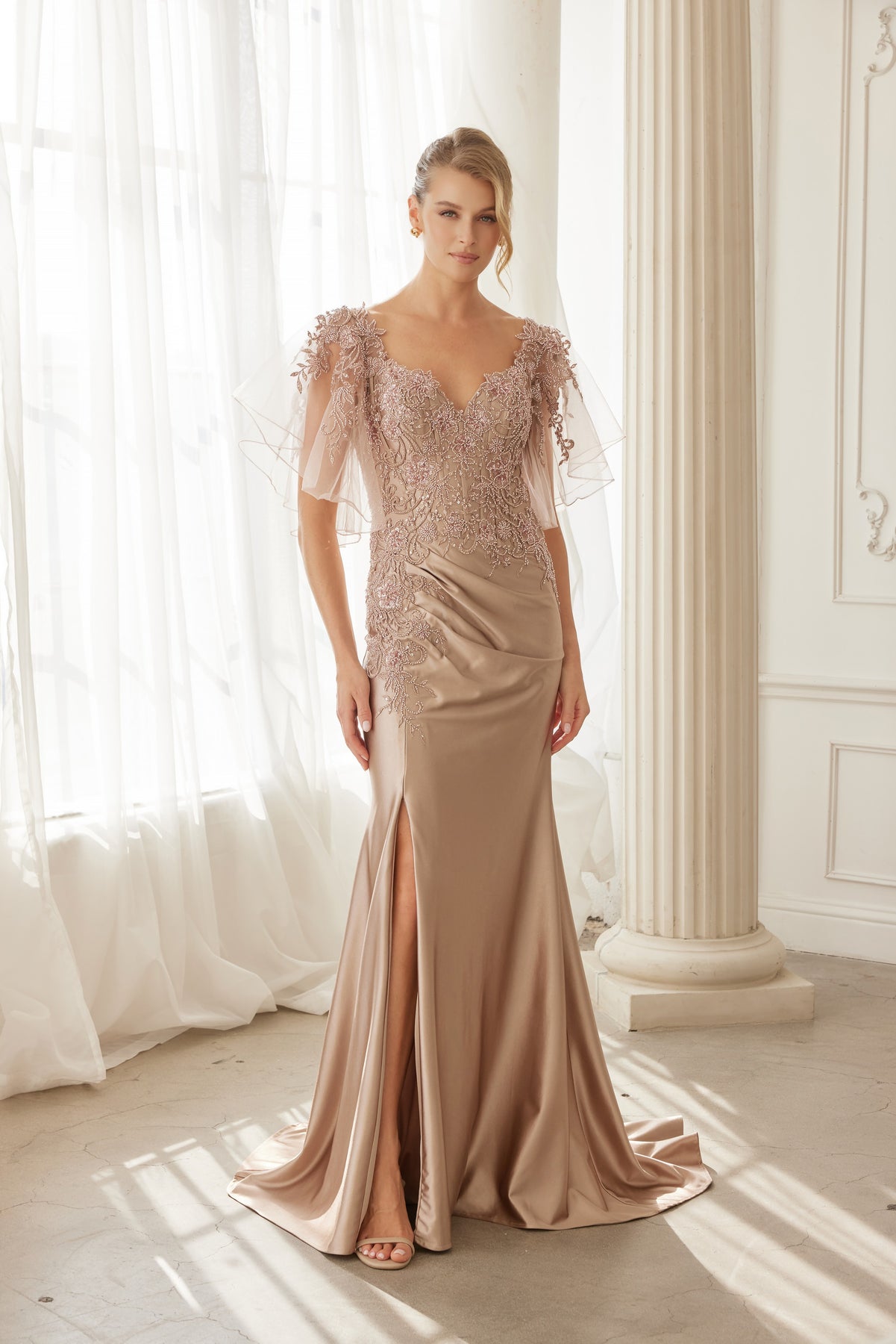 - Beaded Flutter Sleeve Slit Gown by Nox Anabel ME148