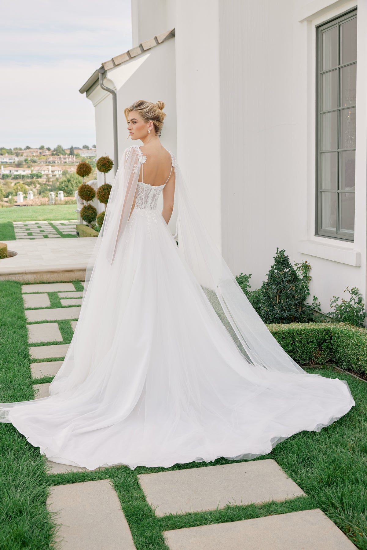 Make a lasting impression in this applique long cape sleeve wedding dress with an A-line skirt by Nox Anabel JW1052. A line tulle gown with a straight neckline and delicate floating tulle sleeves, sequined applique on the bodice, and an illusion back, with a chapel-length train perfect for a dreamy silhouette.