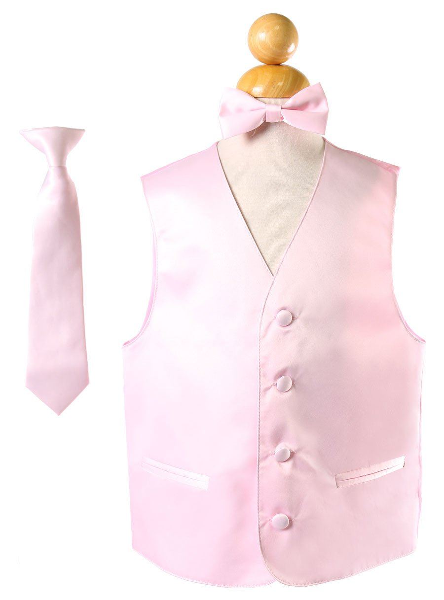 Dapper and timeless, these Boys Satin Vests with Neck Tie and Bow Tie are a great addition for any boy's closet. Featuring matching buttons and side pockets, they also come with a matching neck tie and bow tie. With these vests, you can easily color coordinate outfits with people for any special event because they're offered in many sizes including men sizes.