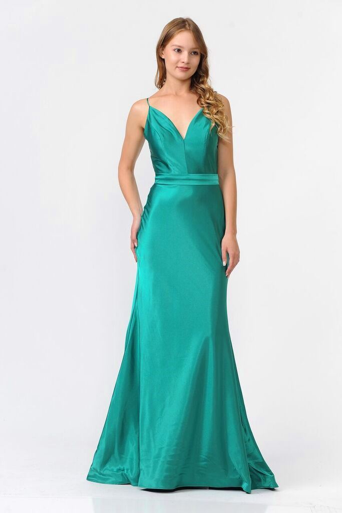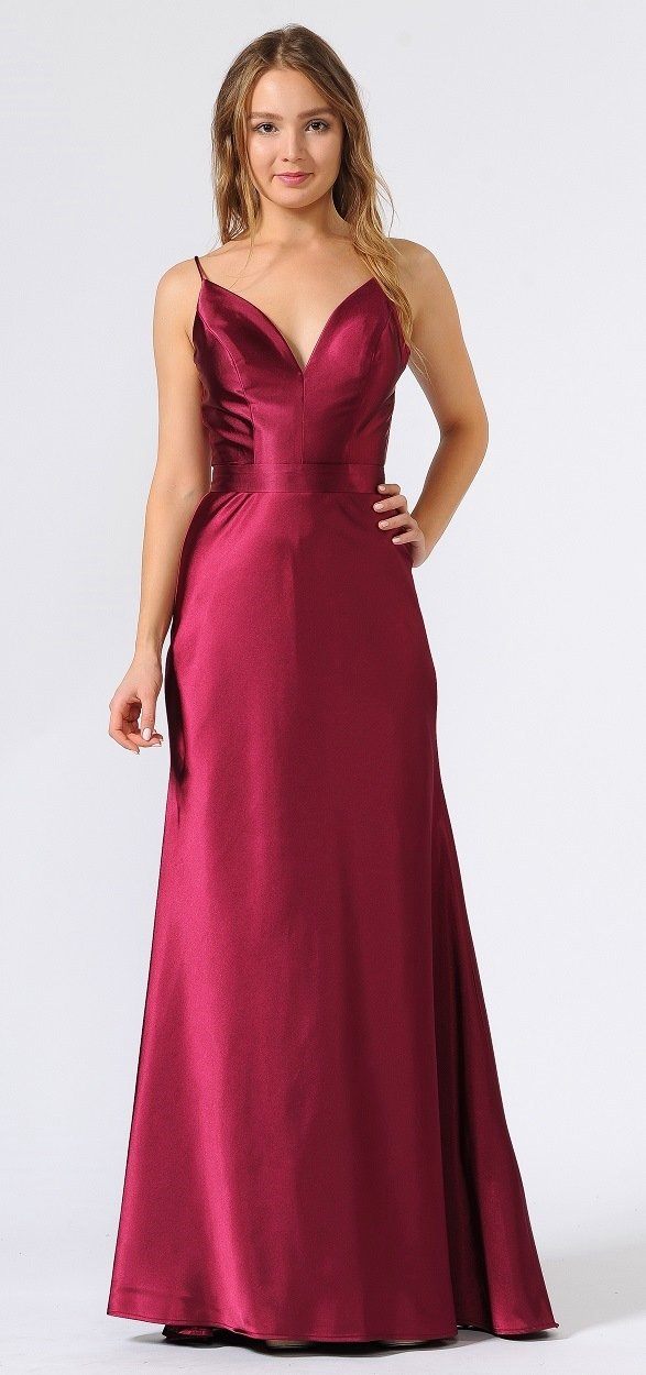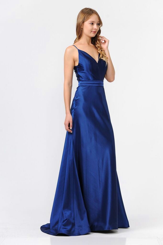 You'll love twirling around in this long V-neck charmeuse dress by Poly USA 9028. This beautiful formal gown features a V-neckline with a waistband, enclosed back, floor length skirt with sweep train, and a zipper closure. Affordably priced under $130, this long evening dress is perfect for any formal event and will keep you on budget!
