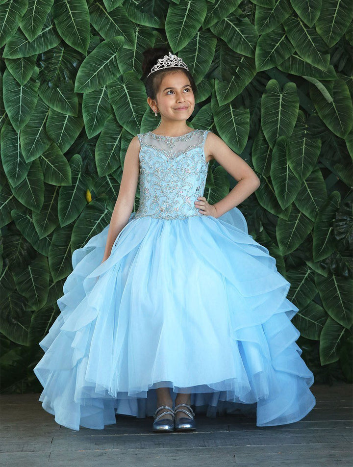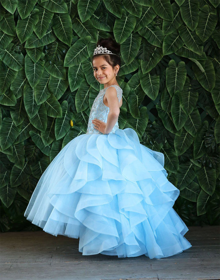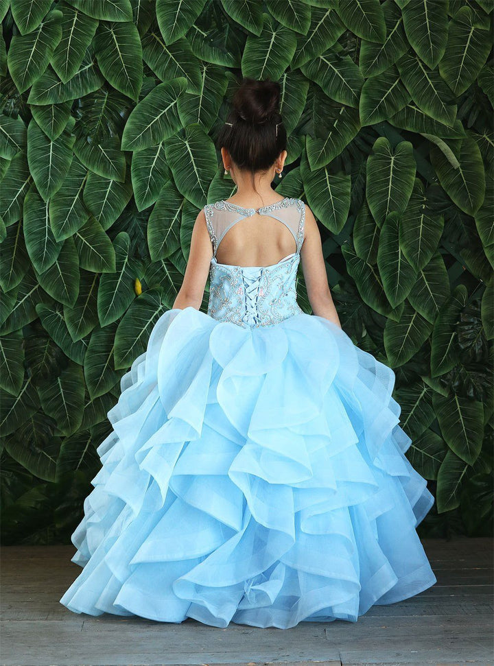 Your sweet girl will look lovely in this long sleeveless dress with ruffled train by Calla Collection KY218. This beautiful sleeveless ball gown features an illusion sweetheart bodice adorned with beaded embellishments, open back with keyhole cutout, a floor length A-line skirt with ruffled sweep train, and a lace-up corset back. Available Matching Quinceanera Style KY79288.