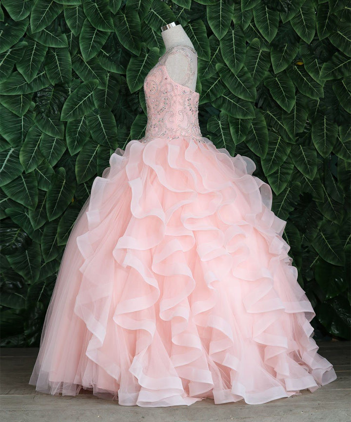 Look picture-perfect in this beaded long illusion sleeveless dress with A-line layered skirt by Calla Collection KY79288. This beautiful ball gown features an illusion sleeveless sweetheart bodice adorned with sparkly beads, floor length A-line skirt with back layered ruffles, and a lace-up corset back. Matching kids style KY218.