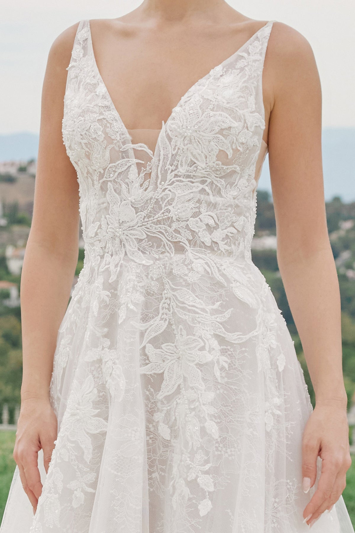 - Sleeveless illusion V-neck bodice with shoulder straps