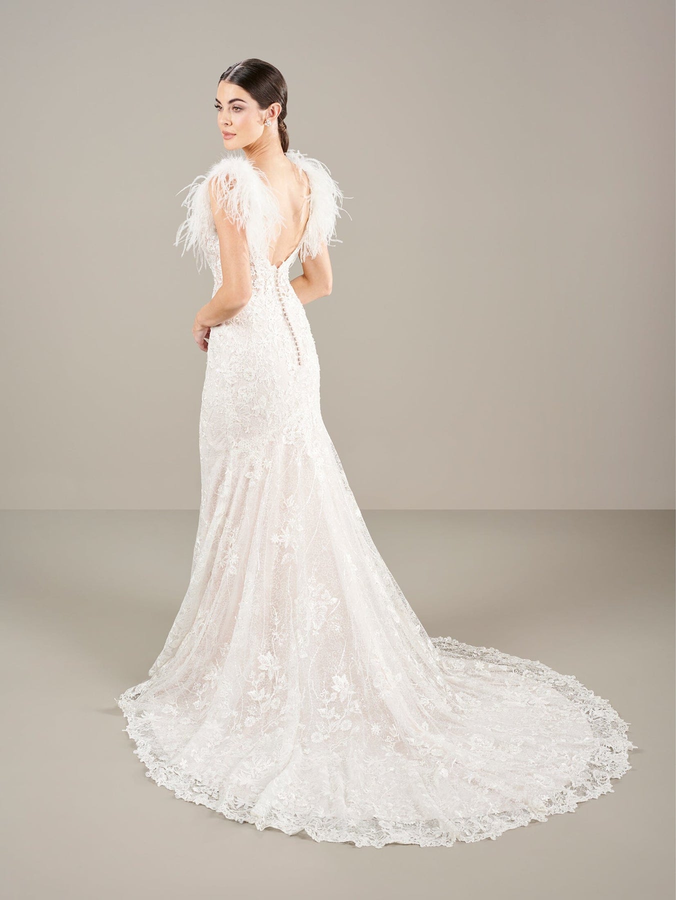 Slim fit and flare style in shimmer over lace has a plunging V-neck with illusion insert at center front. Sleeveless bodice has detachable feathers at shoulders . Low back neckline, covered buttons along zipper closure at the back and sweeping train.