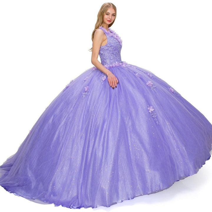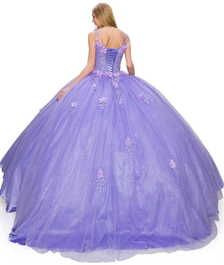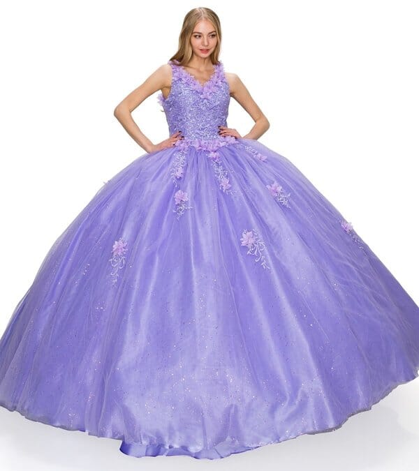 Dance the night away in this 3D floral long V-neck glitter tulle dress with A-line skirt by Cinderella Couture 8025J. This beautiful ballgown features a sleeveless V-neck bodice embellished with 3D floral appliques, open lace-up corset back, and a floor length A-line skirt with a sweep train. Matching little girls' dress sold separately: Style 8025.