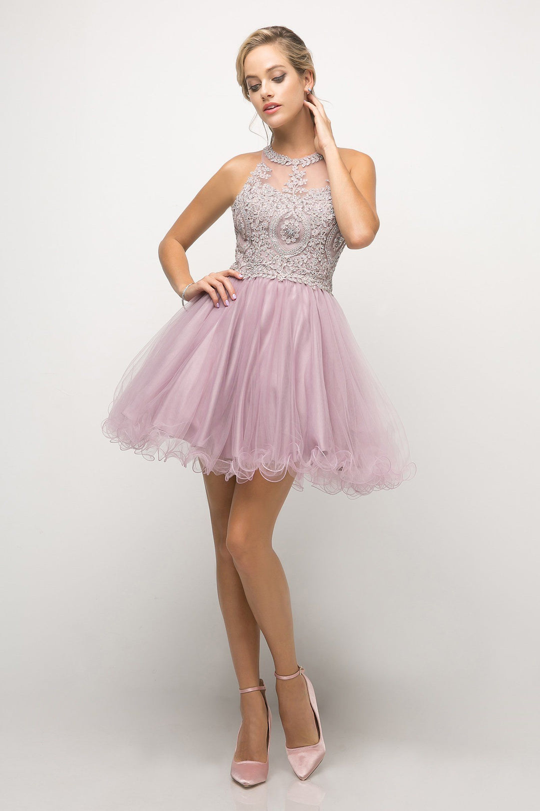 Look super cute in this short ruffled dress with lace applique bodice by Cinderella Divine UJ0119. This cocktail dress features a sleeveless illusion bodice with gorgeous beaded lace appliques, embellished strappy open back, a short hem rolled tulle skirt, and a zipper back.