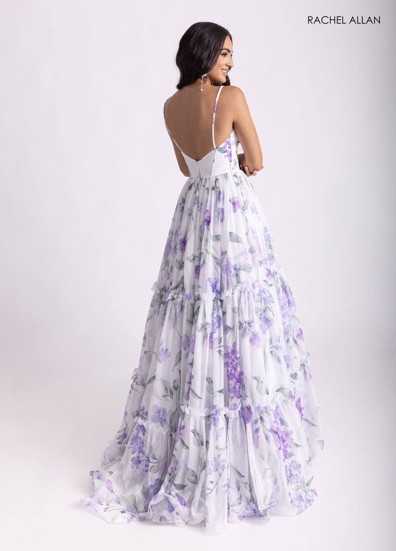 Receive lots of compliments in this floral print long sleeveless dress with an A-line tiered skirt by Rachel Allan 70935. A dreamy floral gown crafted from airy print chiffon over sleek satin. Its tiered A-line skirt sways with every step, while the corset bodice and delicate straps add the perfect touch of romance. Choose White Multi for fresh elegance, Sage Multi for soft garden charm, or Sky Blue Multi for a whimsical feel—perfect for spring formals, pageants, or outdoor soirées.