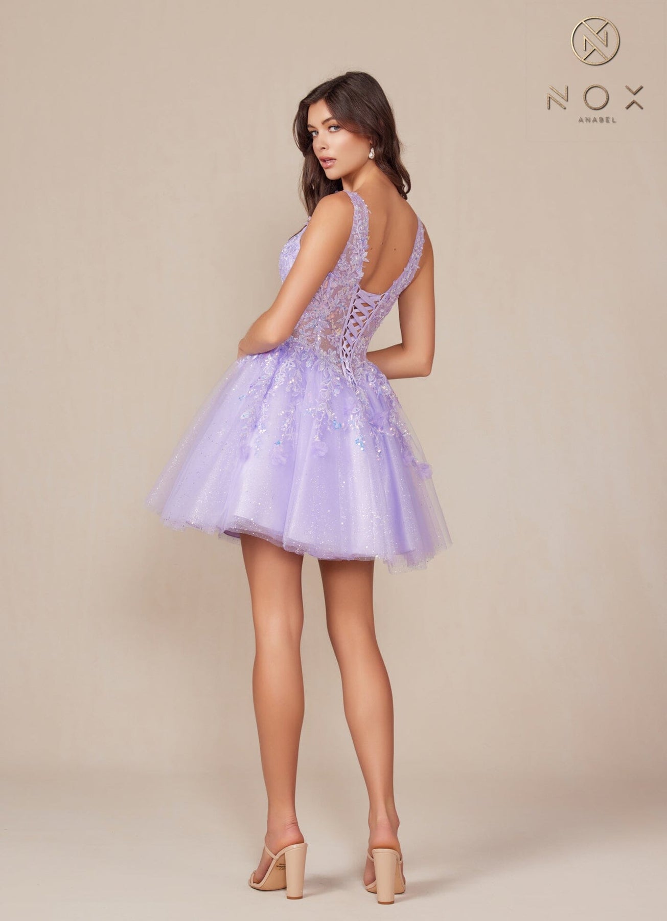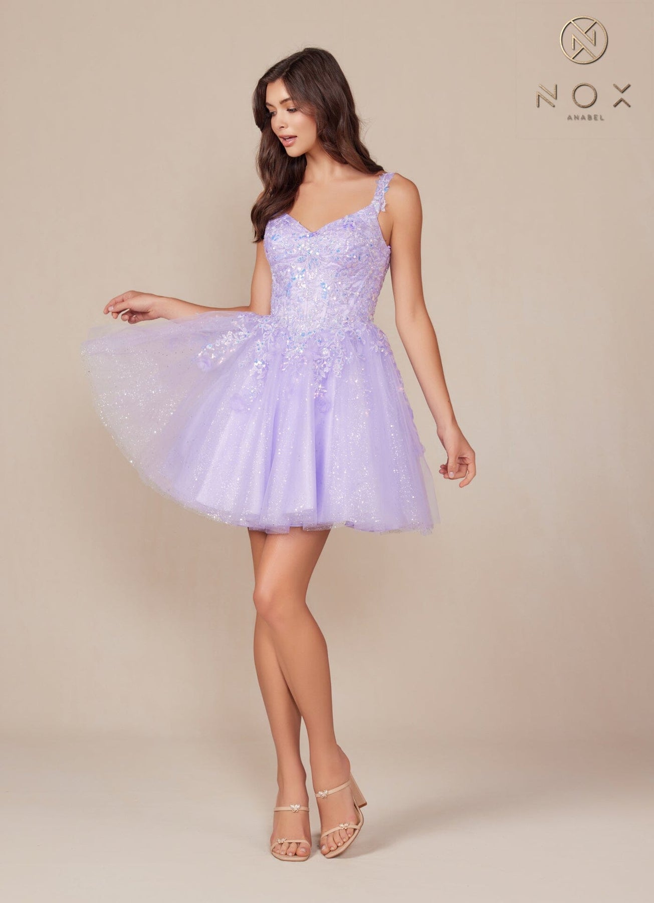 Look unforgettable in this sequin applique short sleeveless dress with an A-line skirt by Nox Anabel H846.