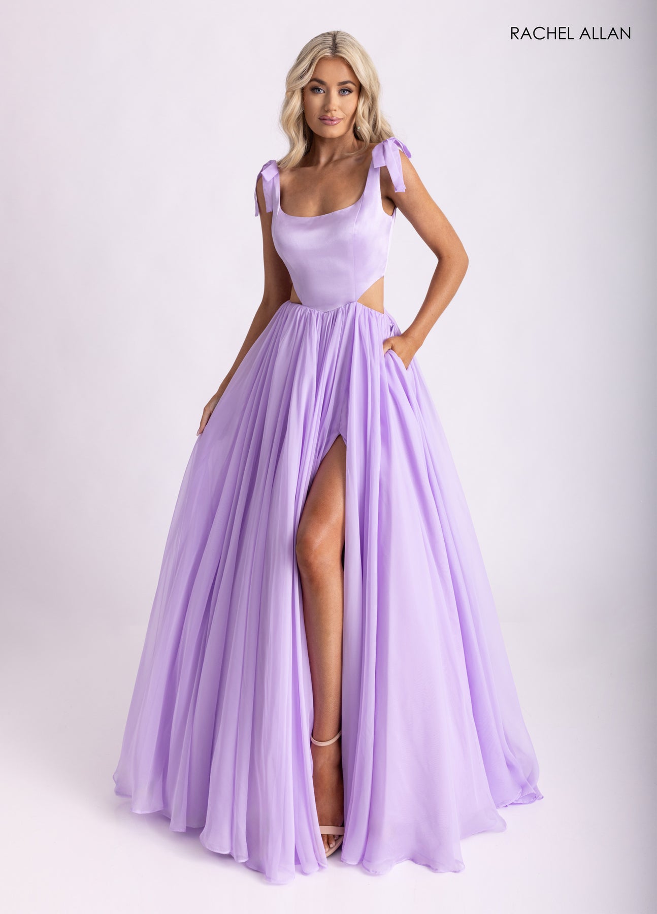 You'll love twirling around in this long sleeveless dress with an A-line slit skirt by Rachel Allan 70980. A satin and chiffon gown featuring bow-tied shoulders, flirty side cutouts, and a flowing skirt with a thigh-high slit. The fitted bodice balances the voluminous silhouette for a perfectly polished look. Perfect for proms, formals, or any fairytale moment.