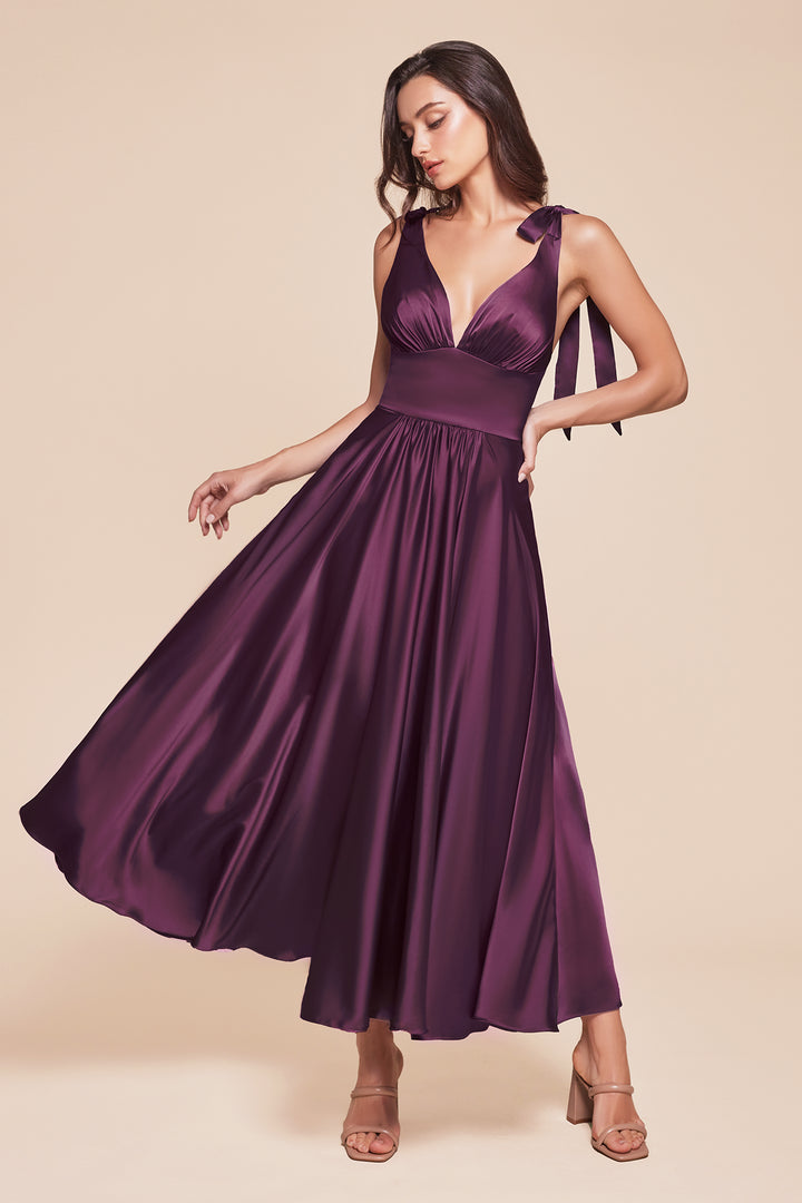Look timeless in this satin sleeveless tea length dress with an A-line skirt from Ladivine by Cinderella Divine 7499. This elegant A-line tea-length dress features tie shoulder straps, a flattering V-neckline, and a gathered waistline for a timeless look. Crafted from soft satin, the fitted bodice flows into a graceful A-line skirt, offering both comfort and style. Perfect for bridesmaids, wedding guests, or formal events.