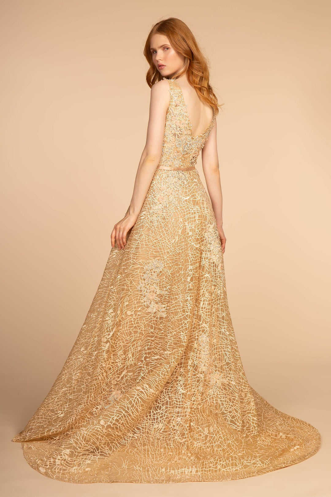Captivate the room in this beaded lace V-neck gown with A-line skirt by GLS Gloria GL2566.