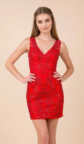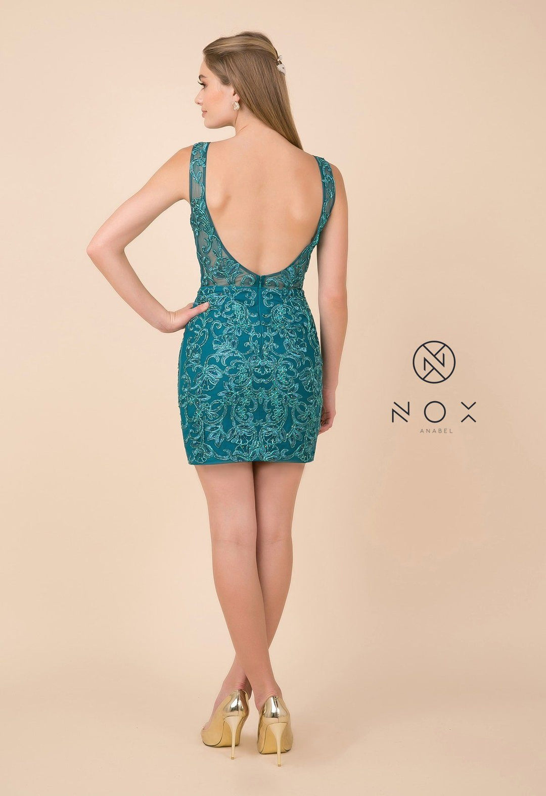 Be selfie ready in this sleeveless V-neck cocktail dress with beaded embroidery by Nox Anabel A671.