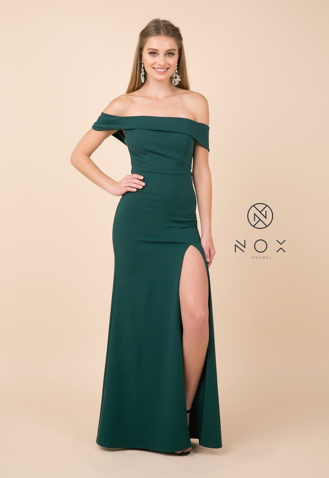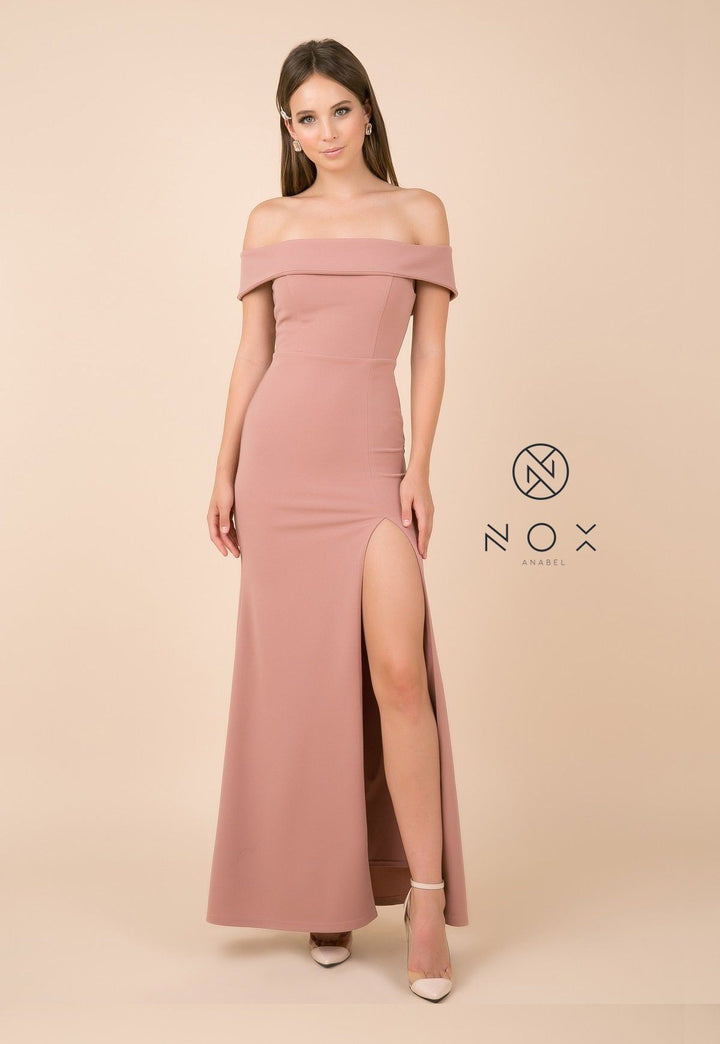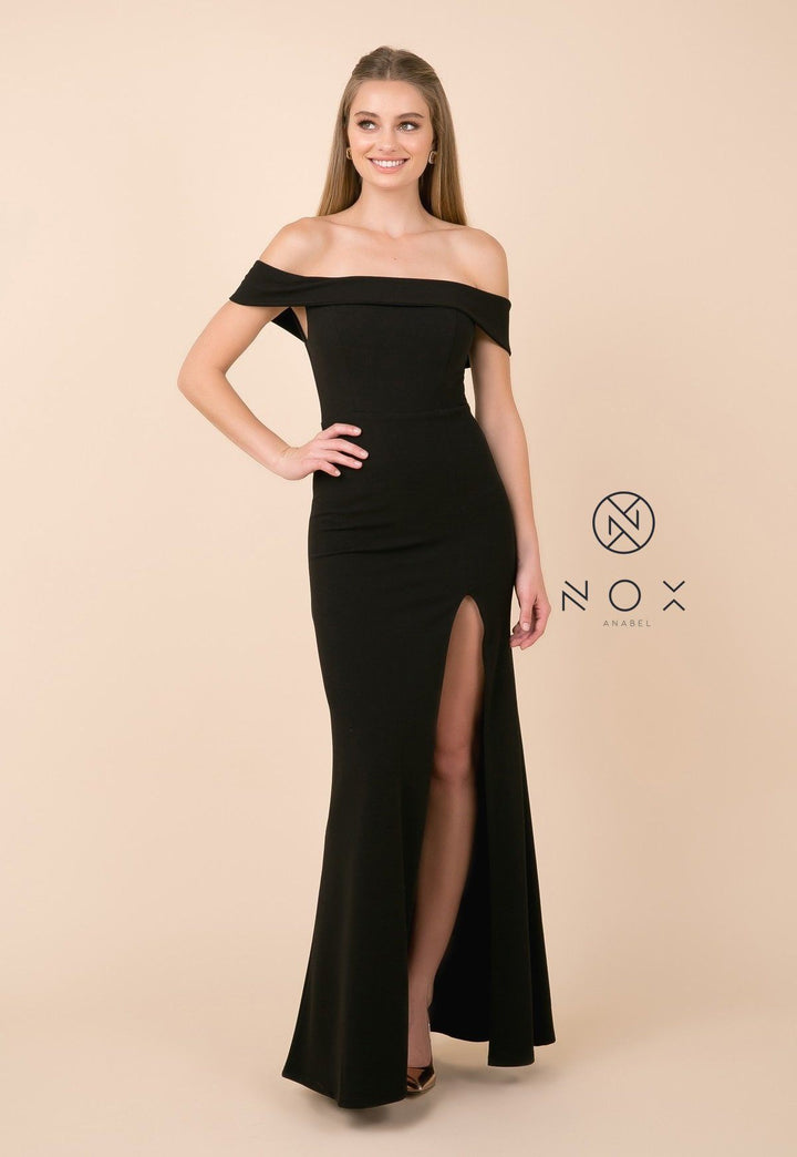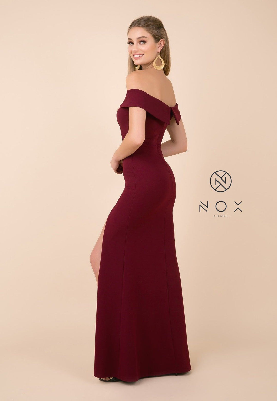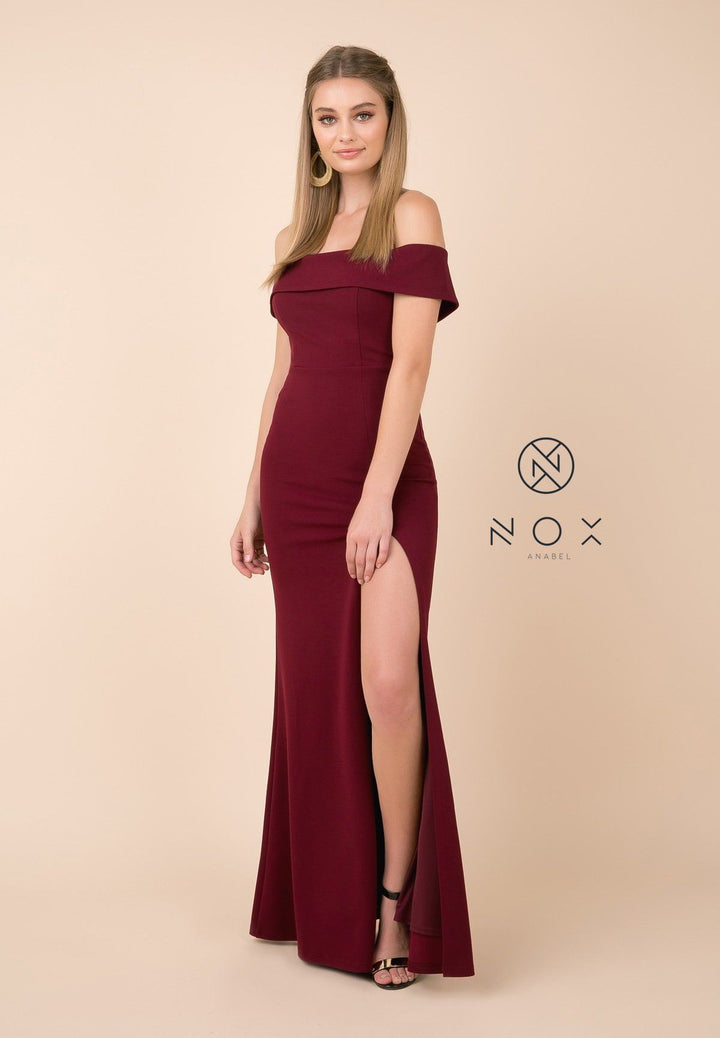 Turn heads in this form fitting long off the shoulder dress with high leg slit by Nox Anabel K401.