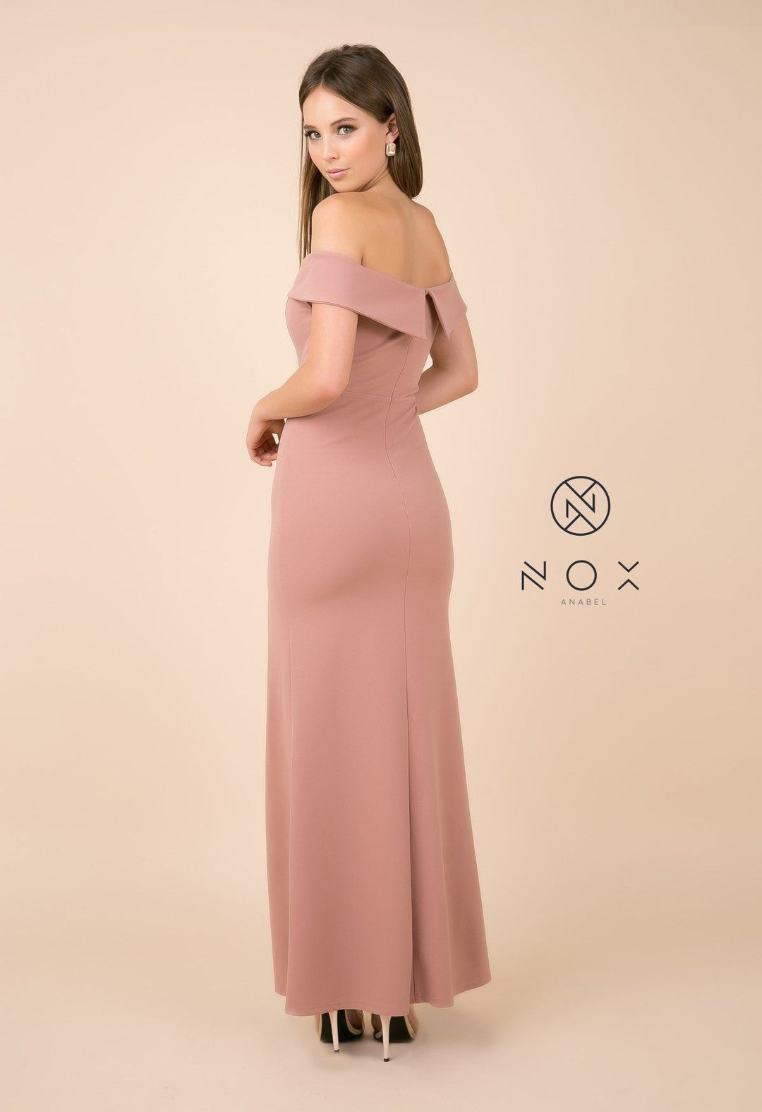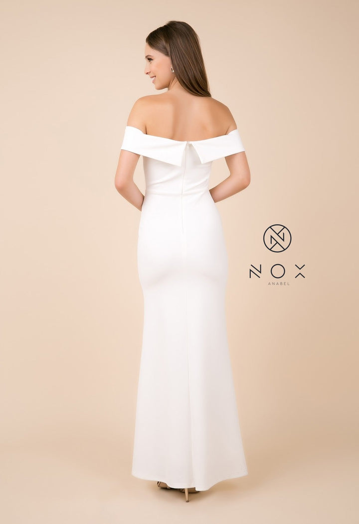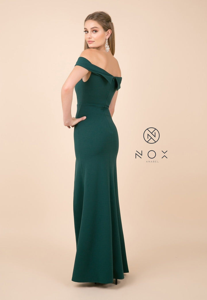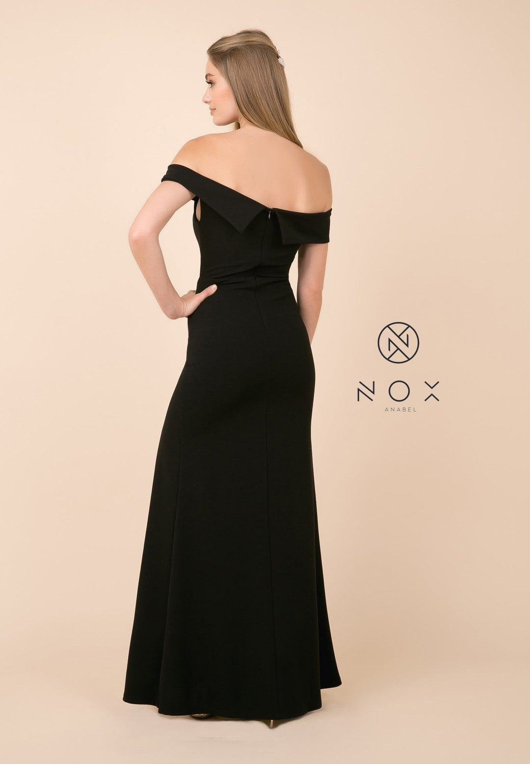 Turn heads in this form fitting long off the shoulder dress with high leg slit by Nox Anabel K401.