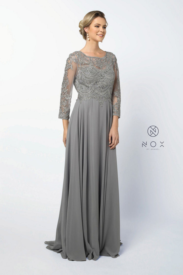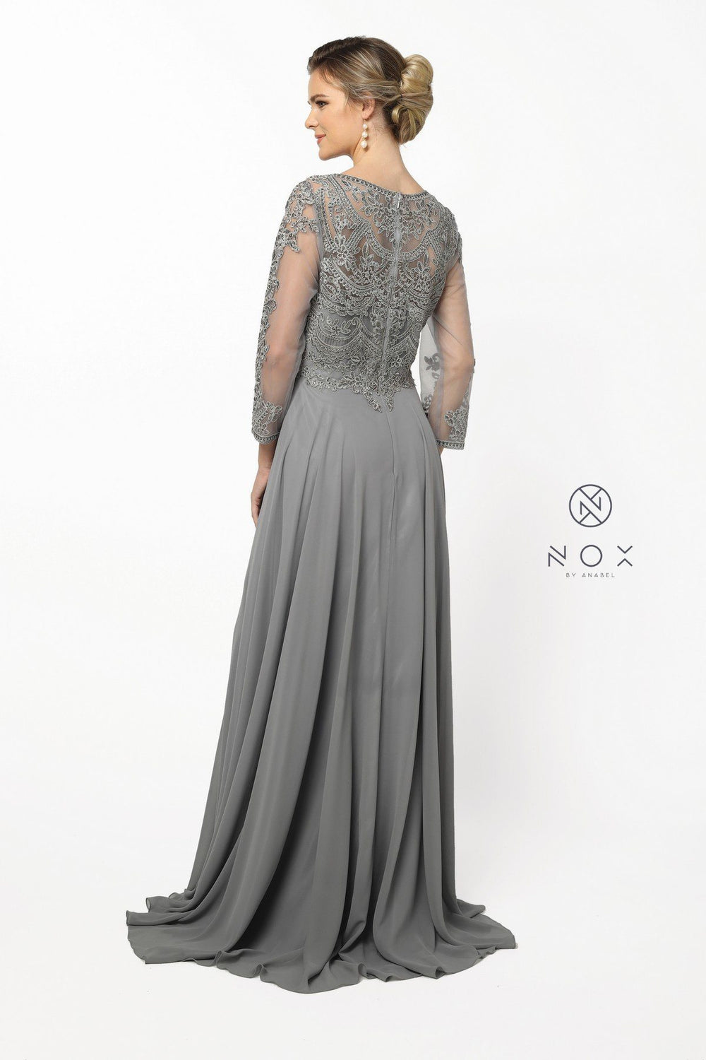 Turn heads in this long appliqued bodice chiffon dress with embellished full length sleeves by Nox Anabel Y513.