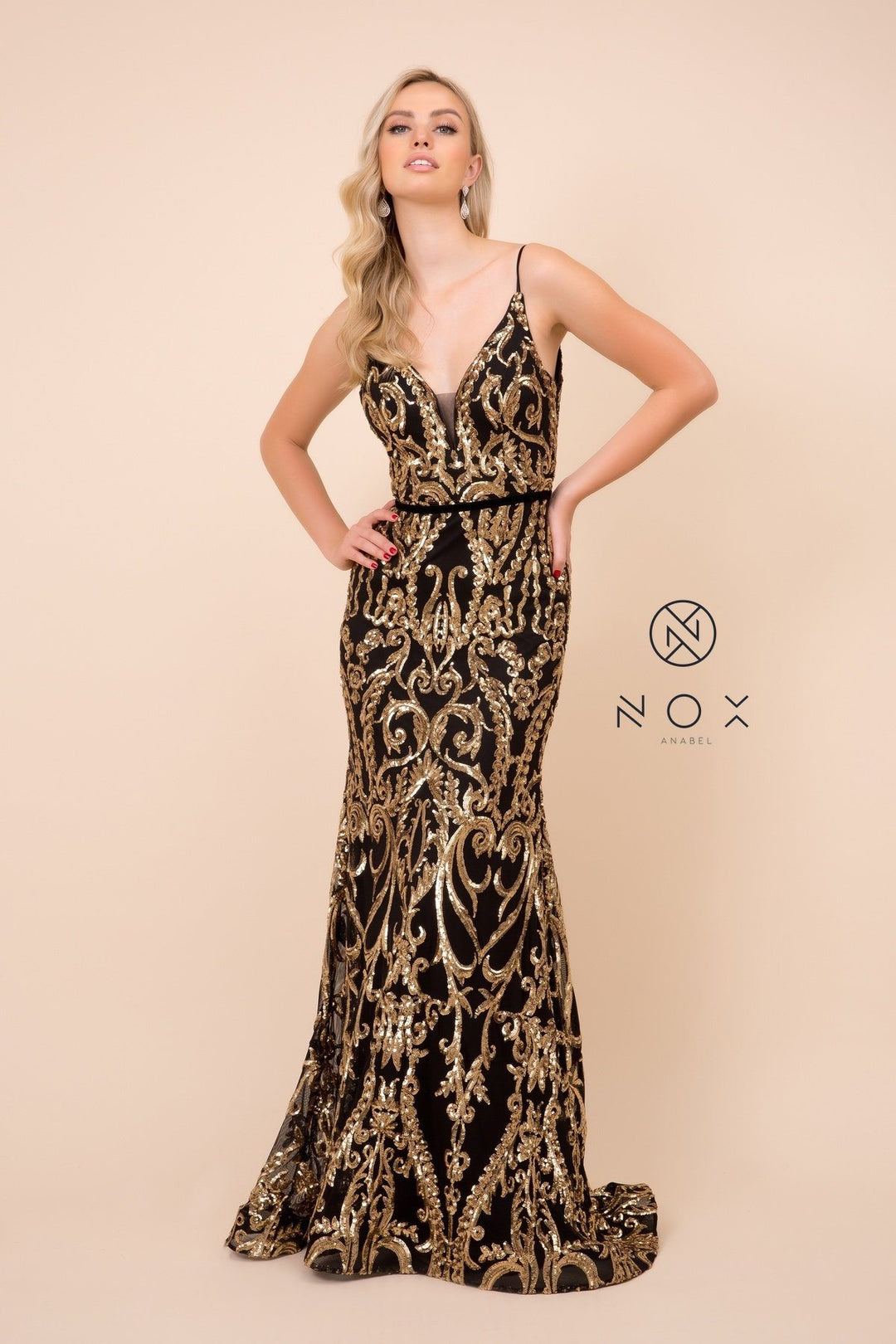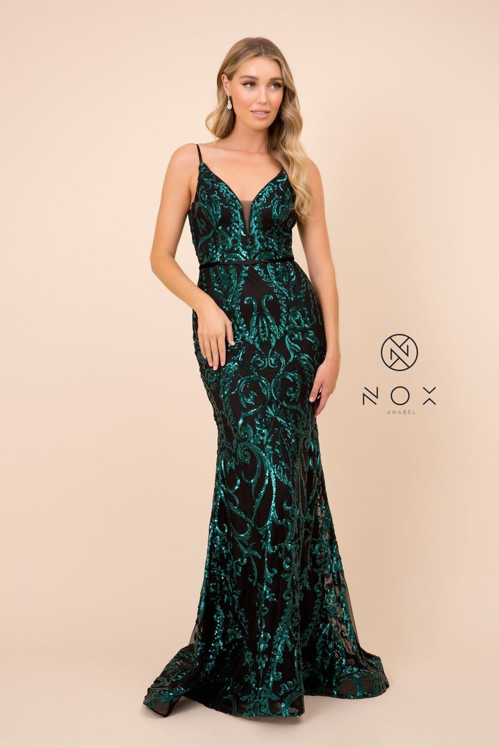 Dance the night away in this long sequined pattern sleeveless mermaid dress by Nox Anabel P417.