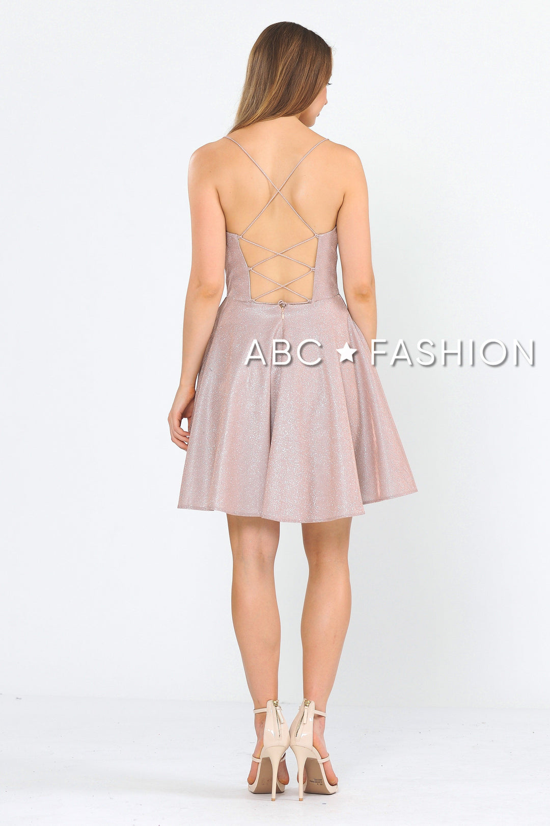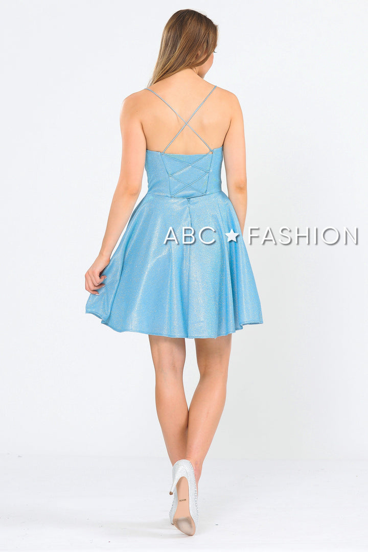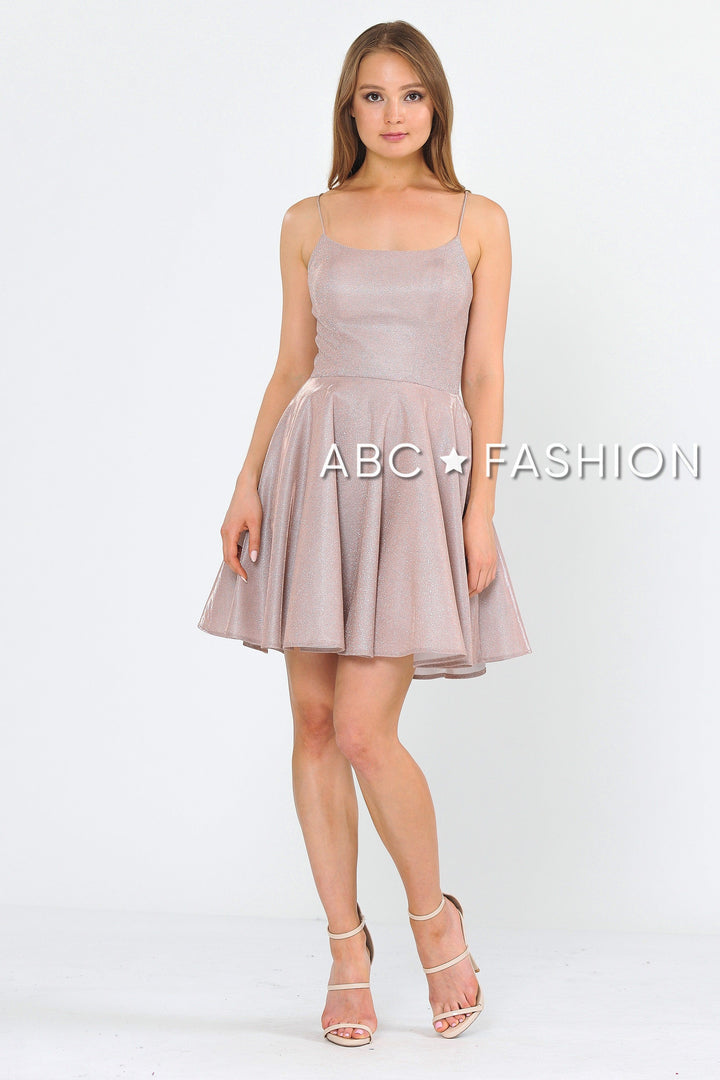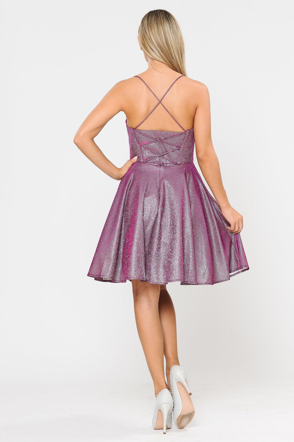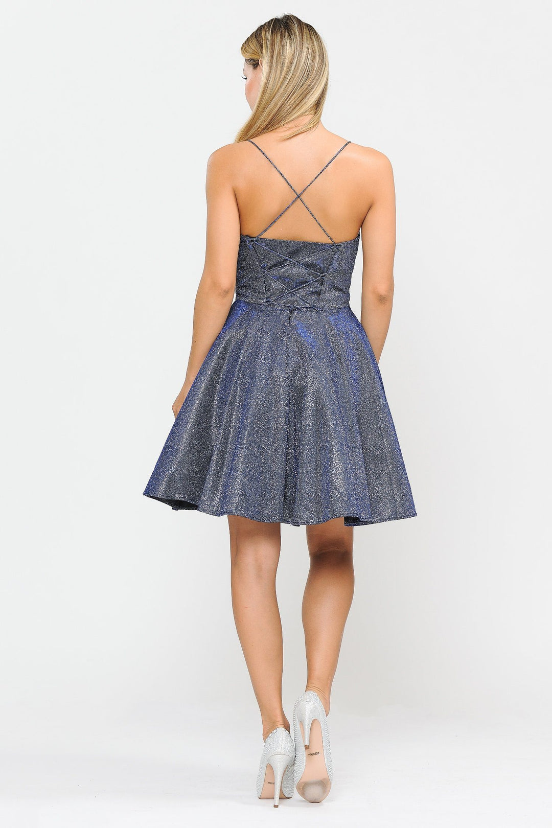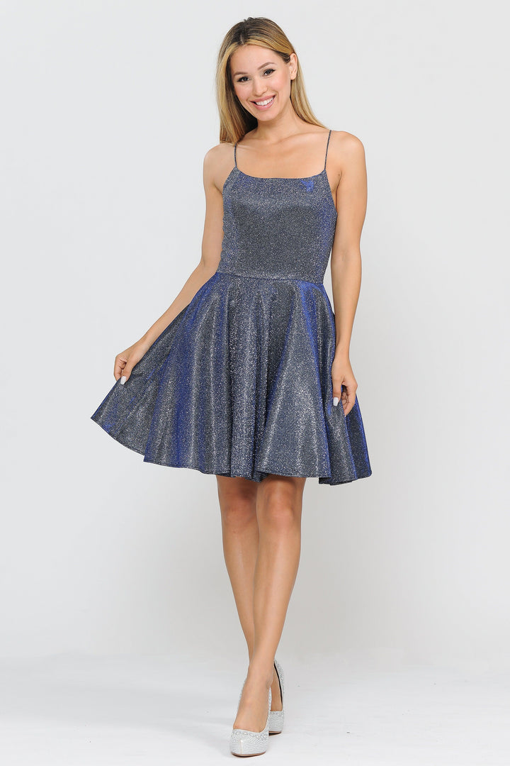 Light up the room in this metallic glitter square-neck cocktail dress with A-line skirt by Poly USA 8220. This beautiful metallic short spaghetti strap dress features a square neck sleeveless bodice, side pockets, open back with thin crisscross straps, short pleated A-line skirt, and a zipper closure.