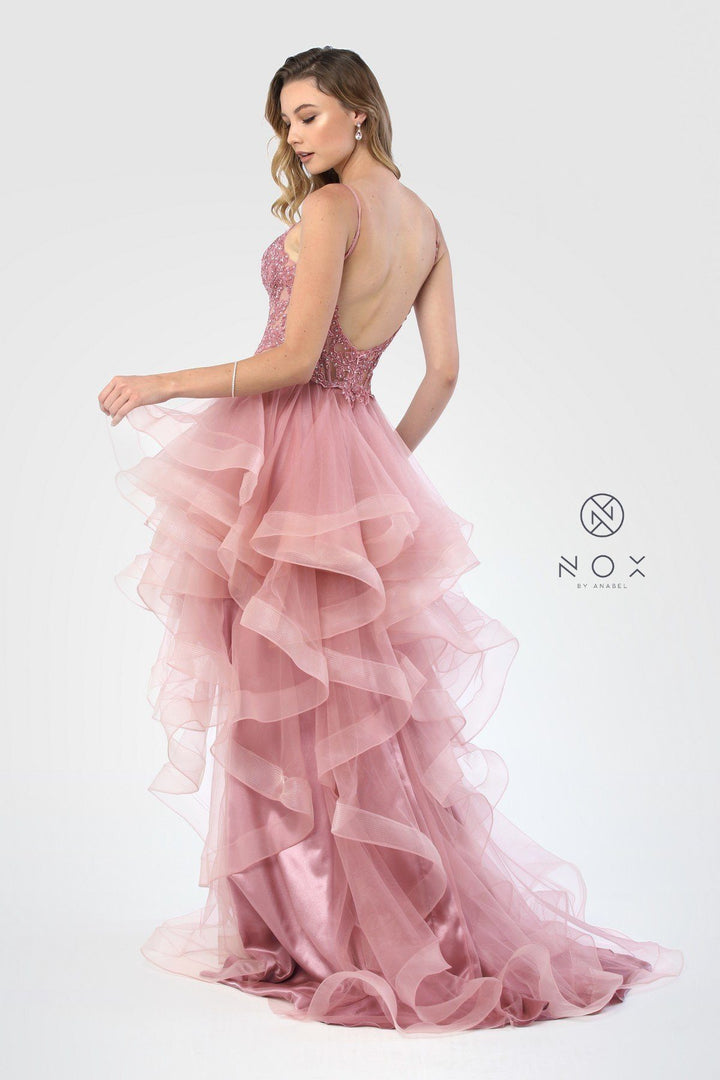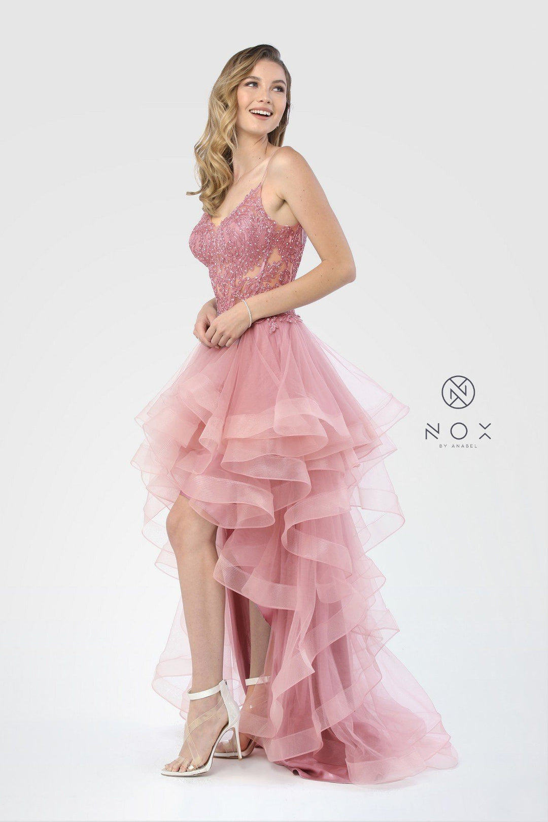 Turn heads in this tiered high low dress with sheer embroidered bodice by Nox Anabel.