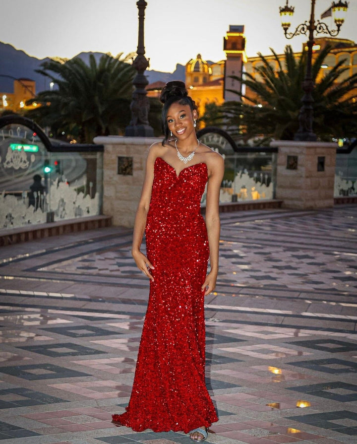 Be selfie ready in this sequined long strapless dress with fitted skirt by Cinderella Divine CH151. Designed into a strapless fitted silhouette, this sequin knockout has a pointed sweetheart neckline and sheer illusion sides. A custom fit is accomplished with a lace up back achieving the perfect size.