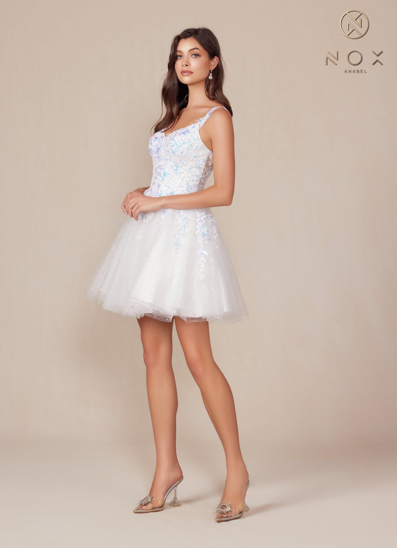 Look unforgettable in this sequin applique short white sleeveless dress with an A-line skirt by Nox Anabel H846W.