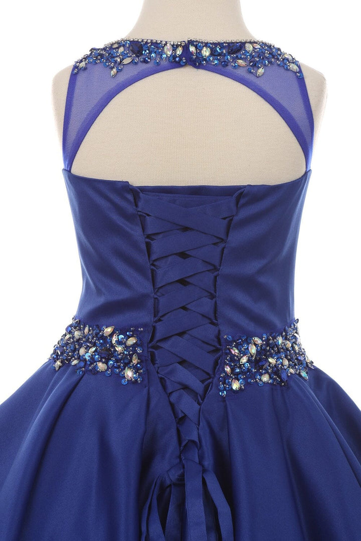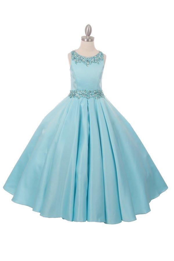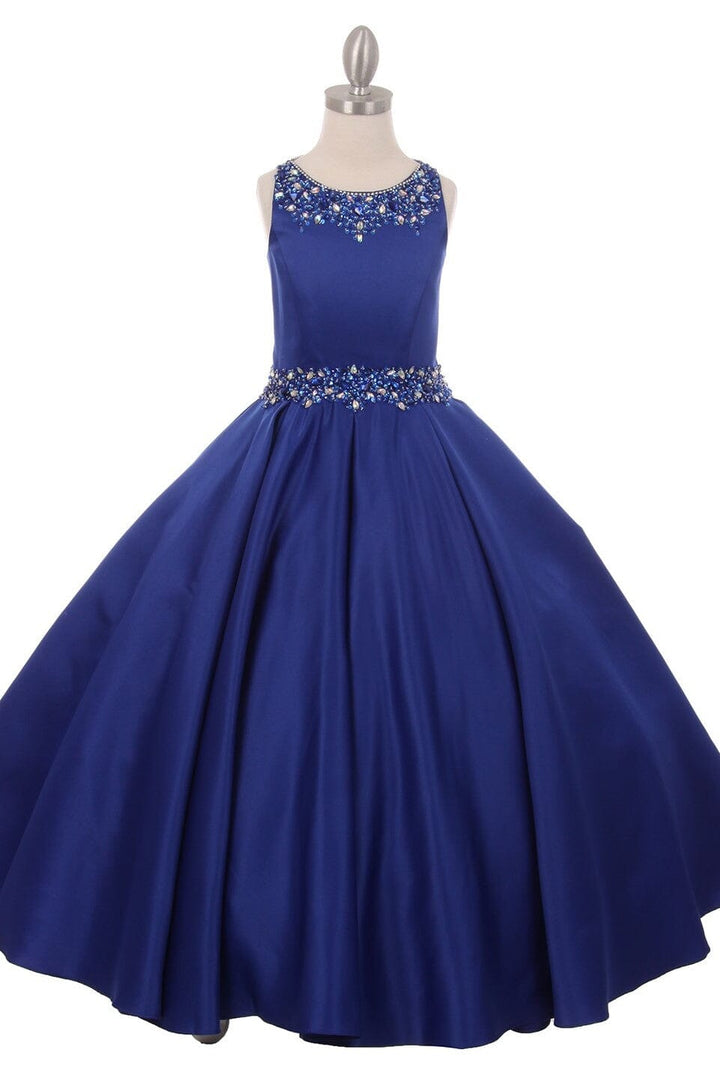 Your little girl will be the Belle of the party in this ball gown! Your precious girl will look lovely in this beaded sleeveless satin dress. This sleeveless floor length gown features a high scoop neckline bodice with shimmering beading adorning the top as well as the waistline, cut out open back, two convenient side pockets, a classic full length pleated A-line skirt, and a lace-up corset back.