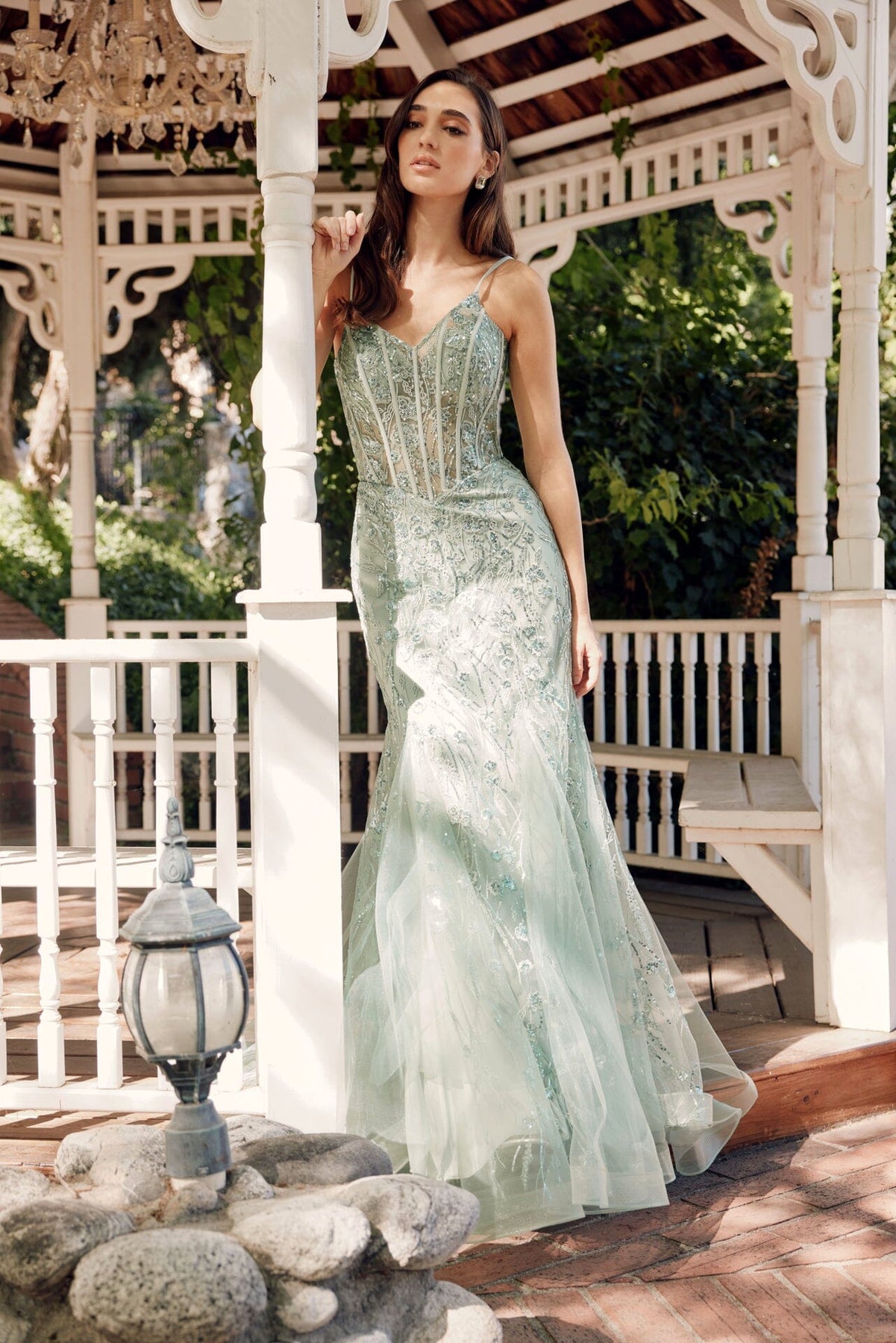 Look mesmerizing in this beaded lace applique long sleeveless corset dress with fitted mermaid skirt by Juliet JT2441S. Lace applique with see-through bodice with corset boning mermaid gown.