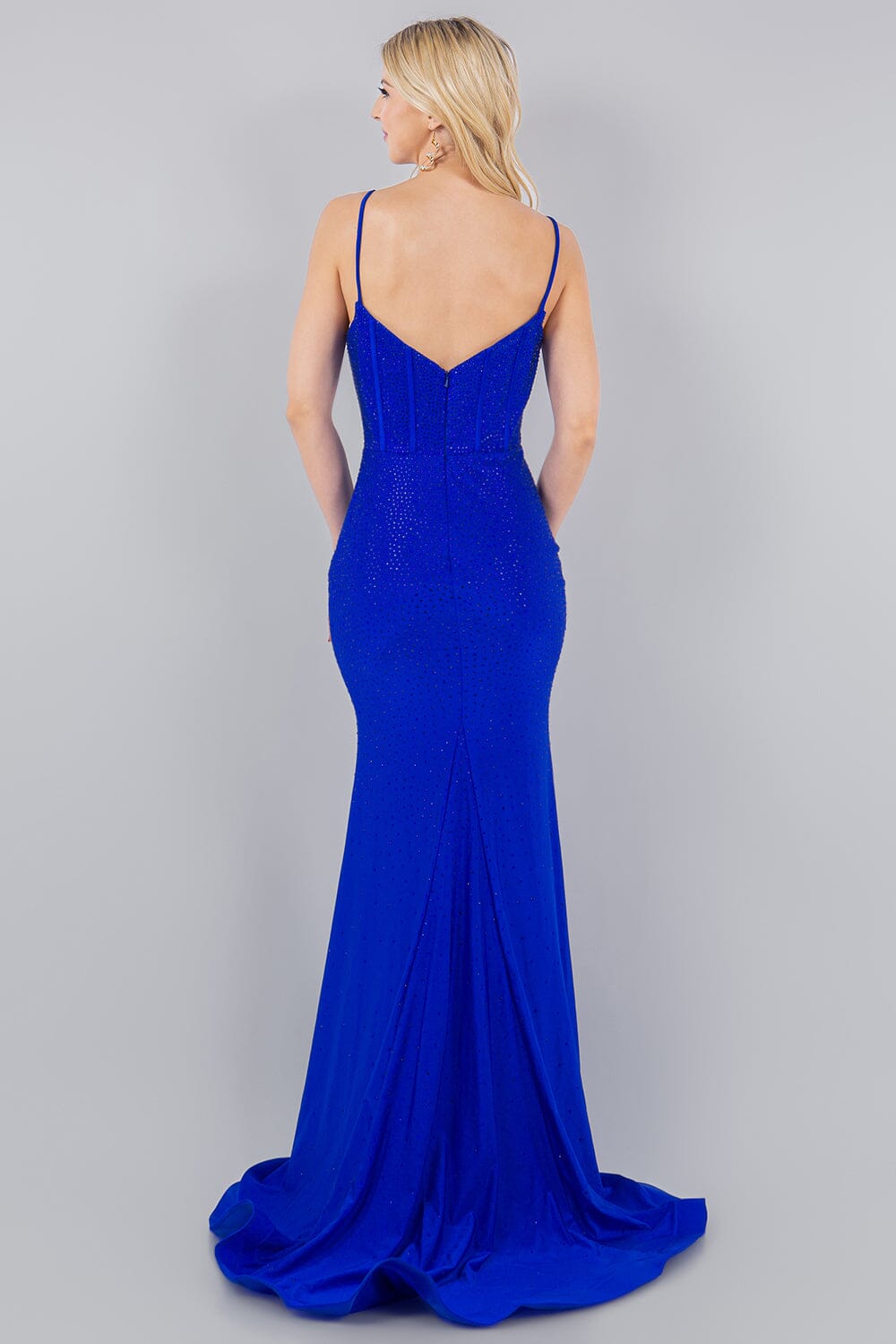 Make a statement in this rhinestone beaded long sleeveless corset dress with fitted skirt by Cinderella Couture 8084J. This Gatsby-esque gown features a stunning allover platinum beaded pattern. It's lined in a satin tailored to a dramatic trumpet silhouette for the perfect hourglass shape. The circular pooling hemline is accentuated with horsehair trim.