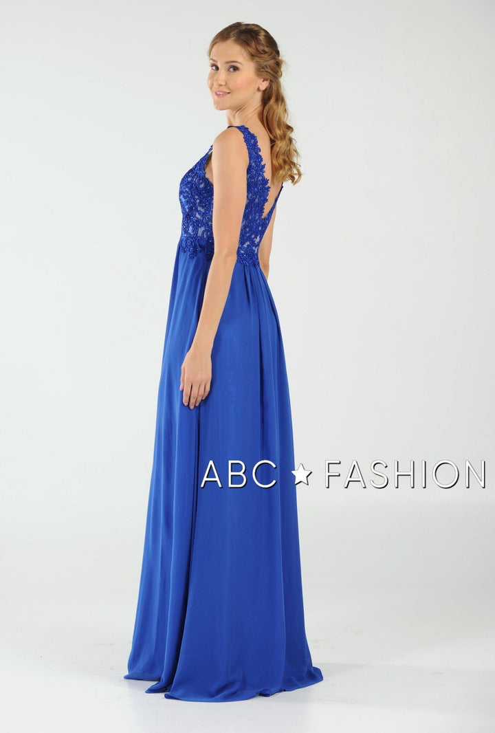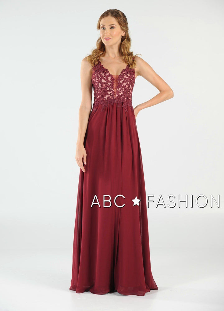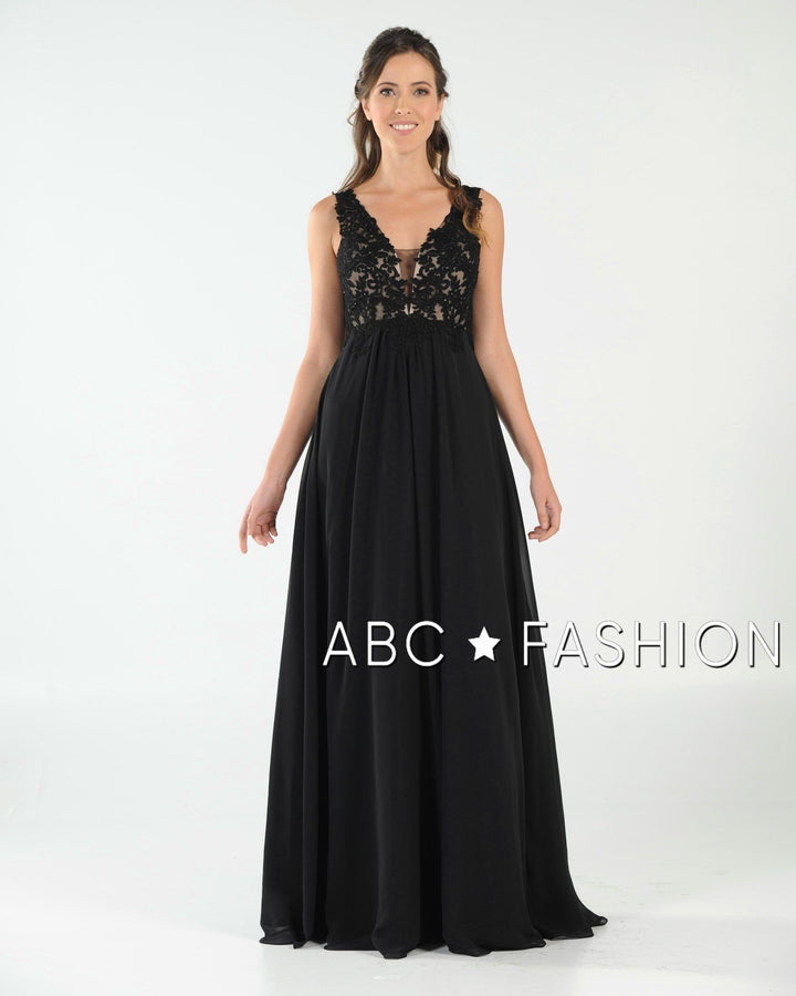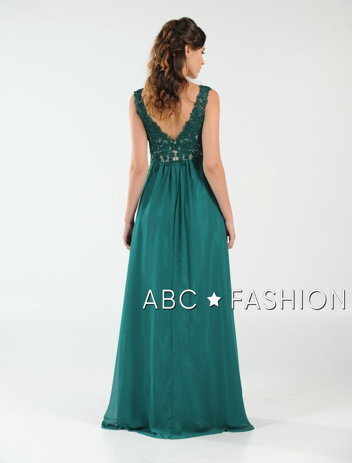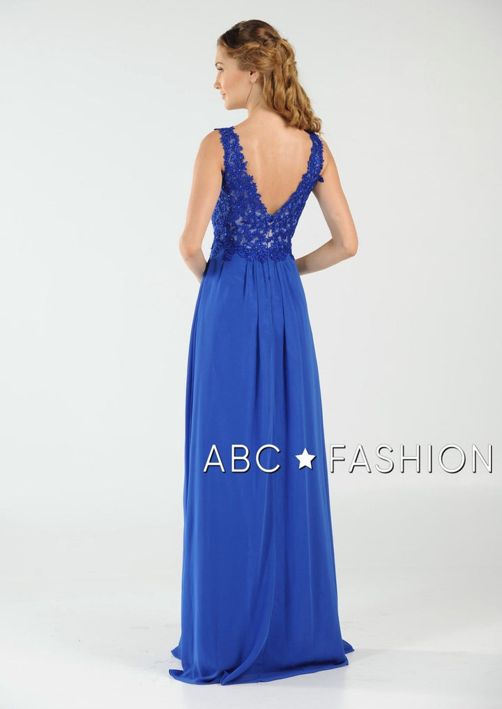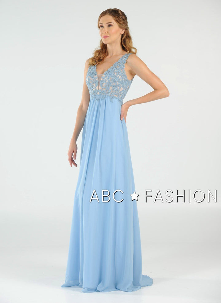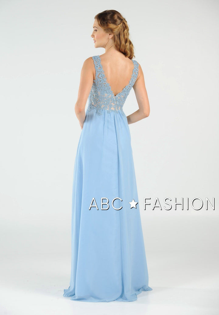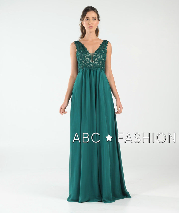 Dance the night away in this V-neck chiffon gown with lace appliqued bodice by Poly USA 8012. Beautiful and elegant chiffon dress with a deep V-neck bodice secured with a sheer inset panel, lovely lace appliques accented with beads cover the bodice gently cascades to the natural waist, open V-back, floor length A-line skirt, and a zipper closure. Affordably priced under $200, this dress is perfect for any formal event and will keep you on budget!