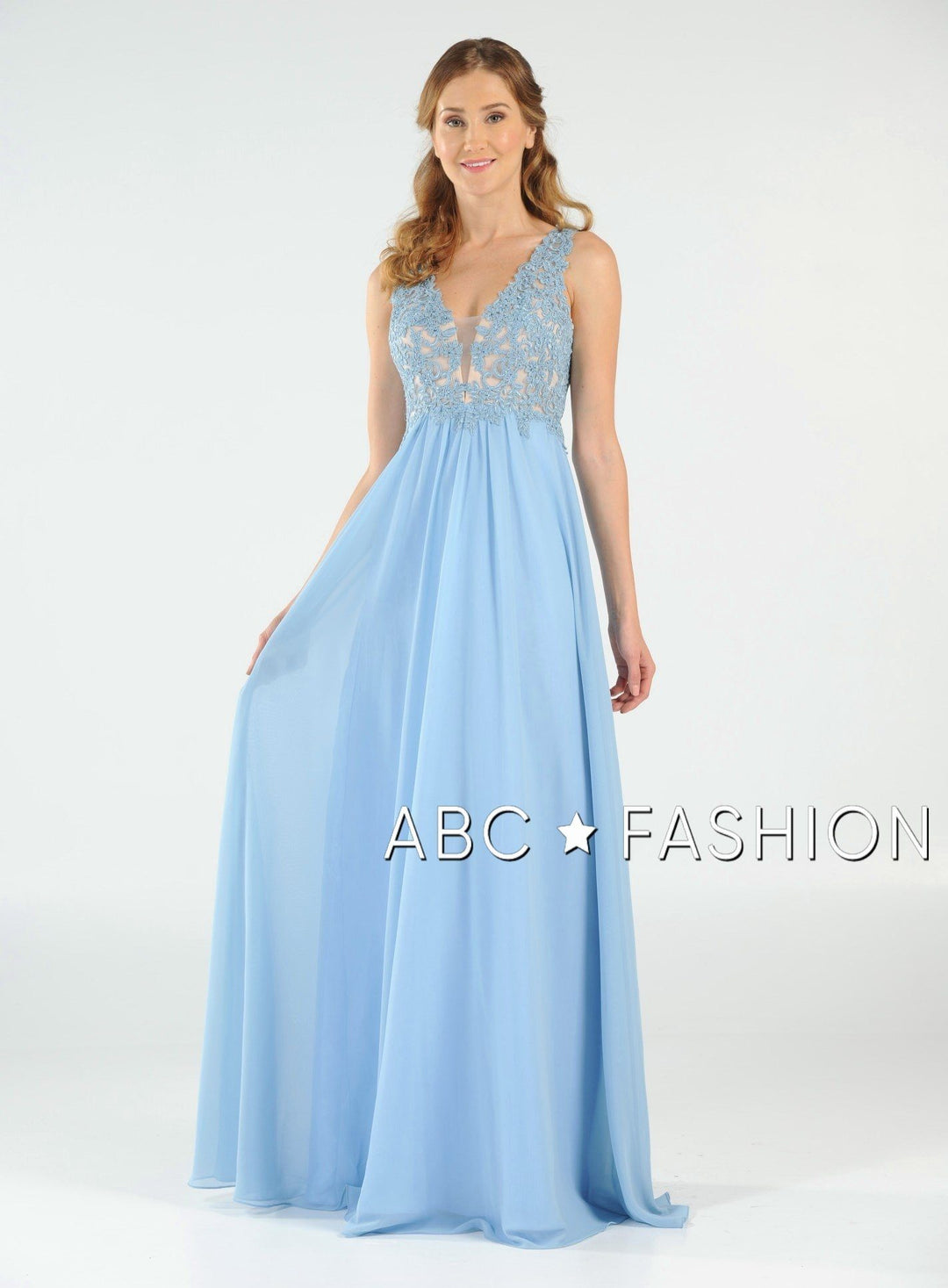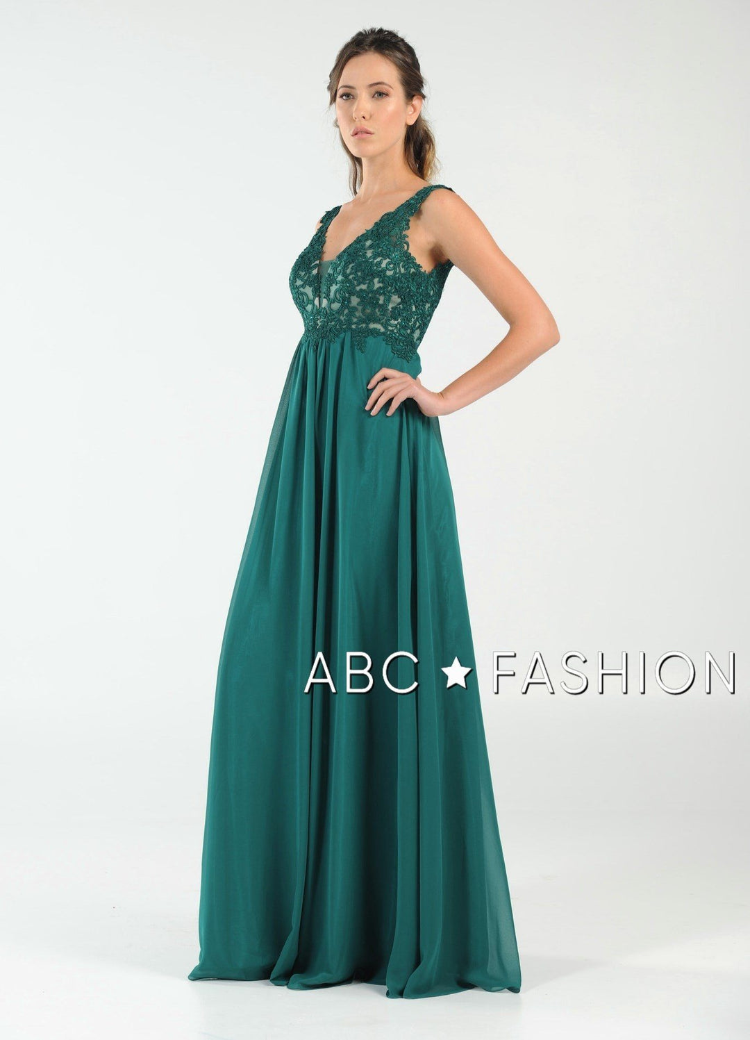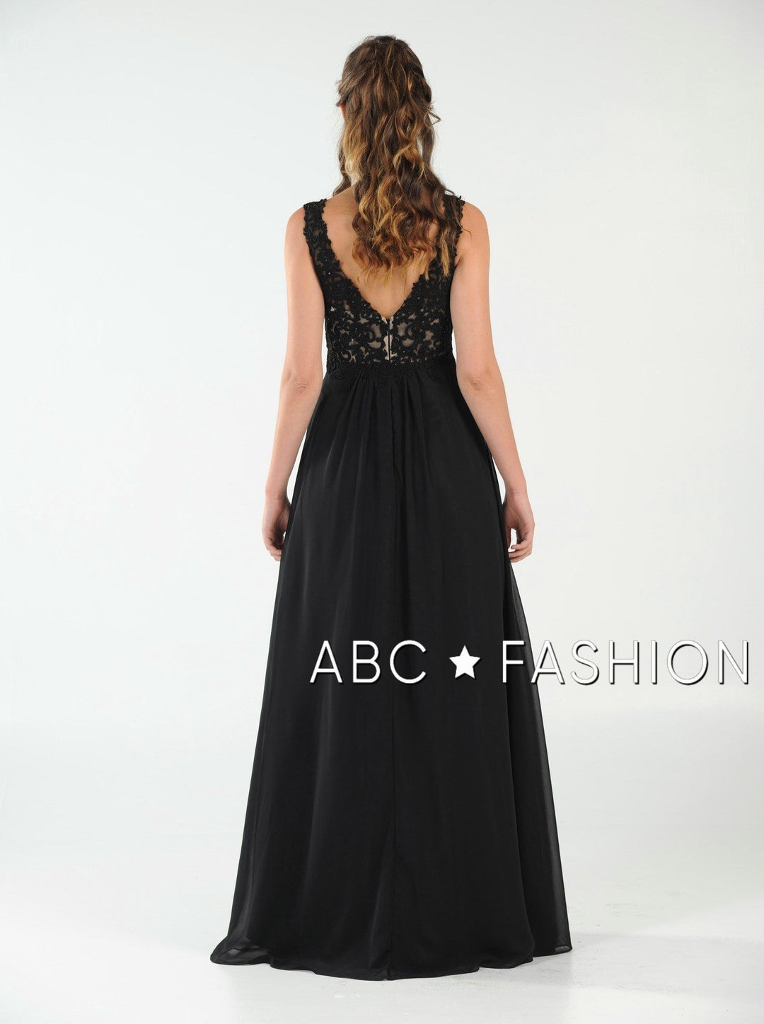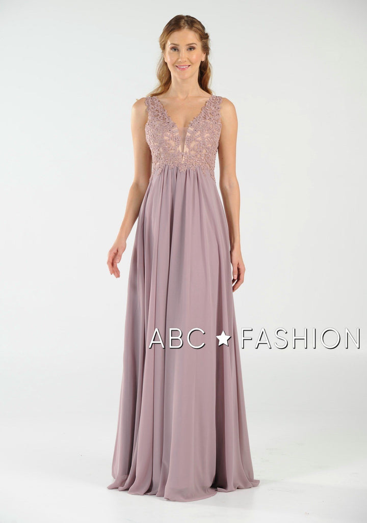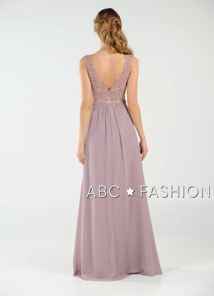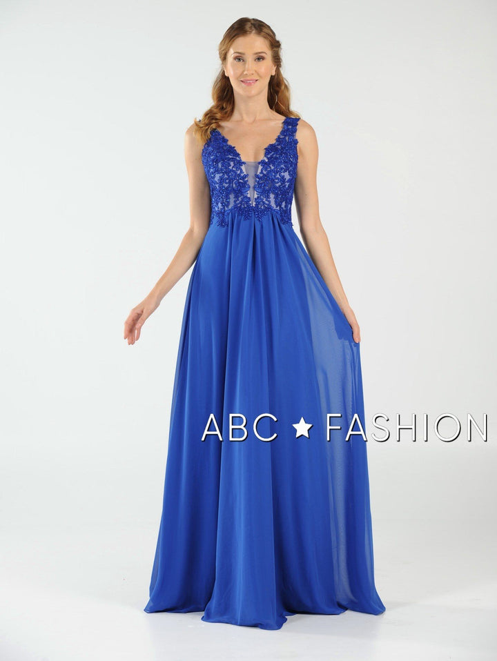 Dance the night away in this V-neck chiffon gown with lace appliqued bodice by Poly USA 8012. Beautiful and elegant chiffon dress with a deep V-neck bodice secured with a sheer inset panel, lovely lace appliques accented with beads cover the bodice gently cascades to the natural waist, open V-back, floor length A-line skirt, and a zipper closure. Affordably priced under $200, this dress is perfect for any formal event and will keep you on budget!