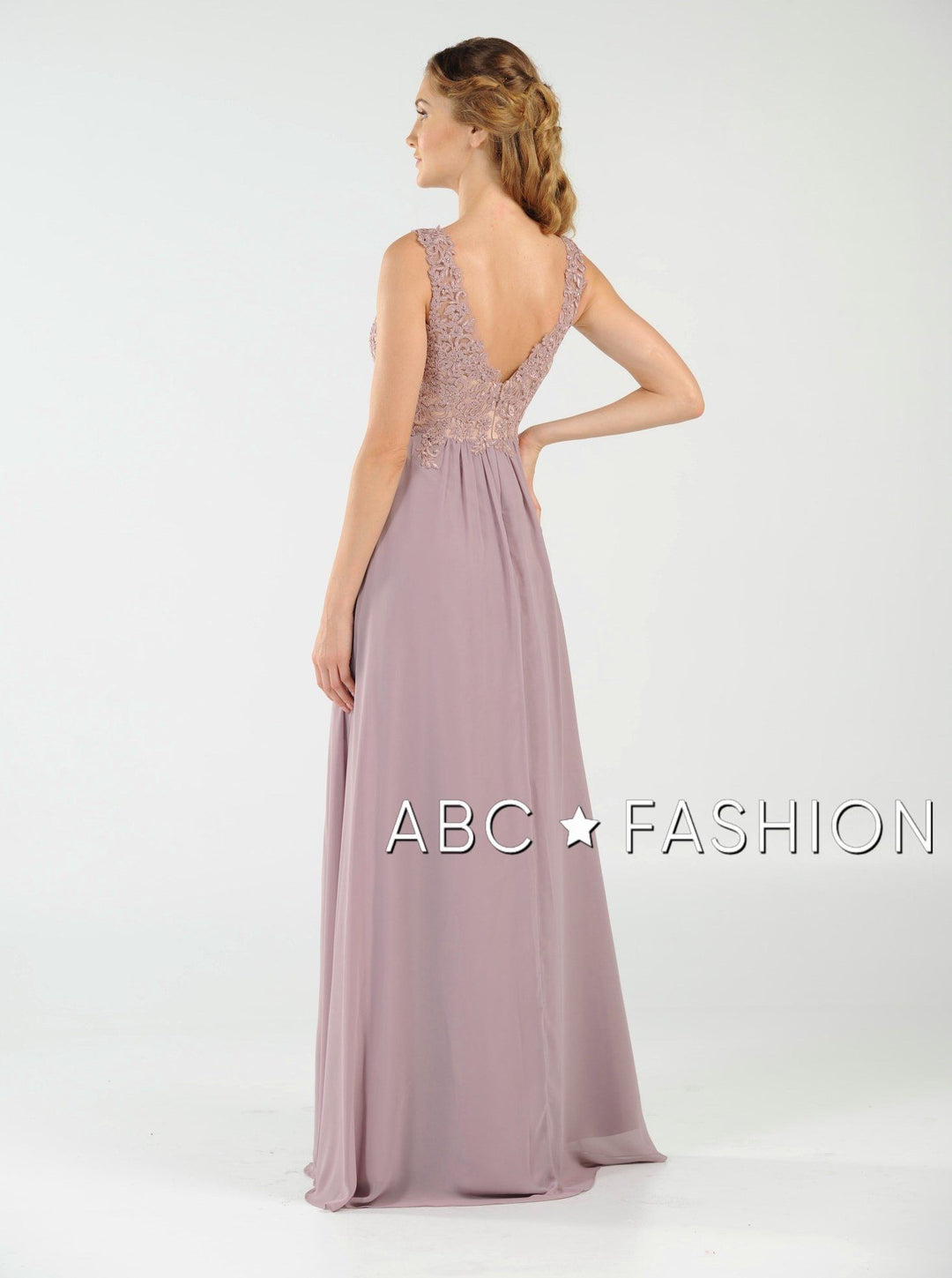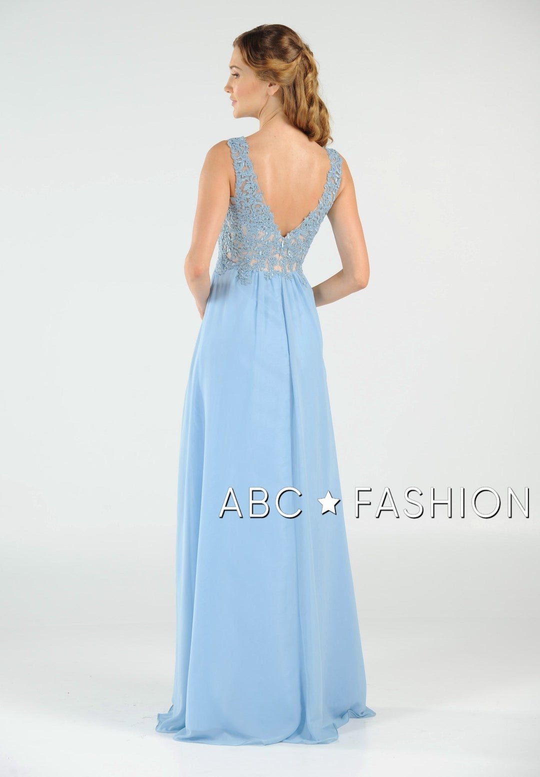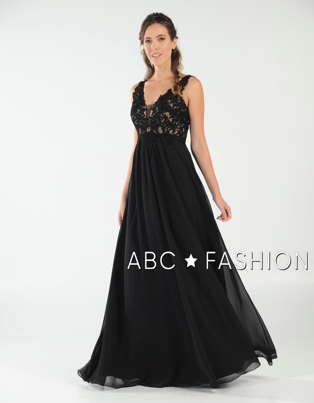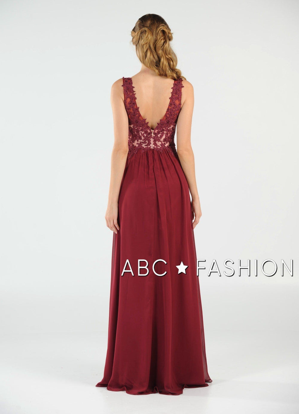 Dance the night away in this V-neck chiffon gown with lace appliqued bodice by Poly USA 8012. Beautiful and elegant chiffon dress with a deep V-neck bodice secured with a sheer inset panel, lovely lace appliques accented with beads cover the bodice gently cascades to the natural waist, open V-back, floor length A-line skirt, and a zipper closure. Affordably priced under $200, this dress is perfect for any formal event and will keep you on budget!