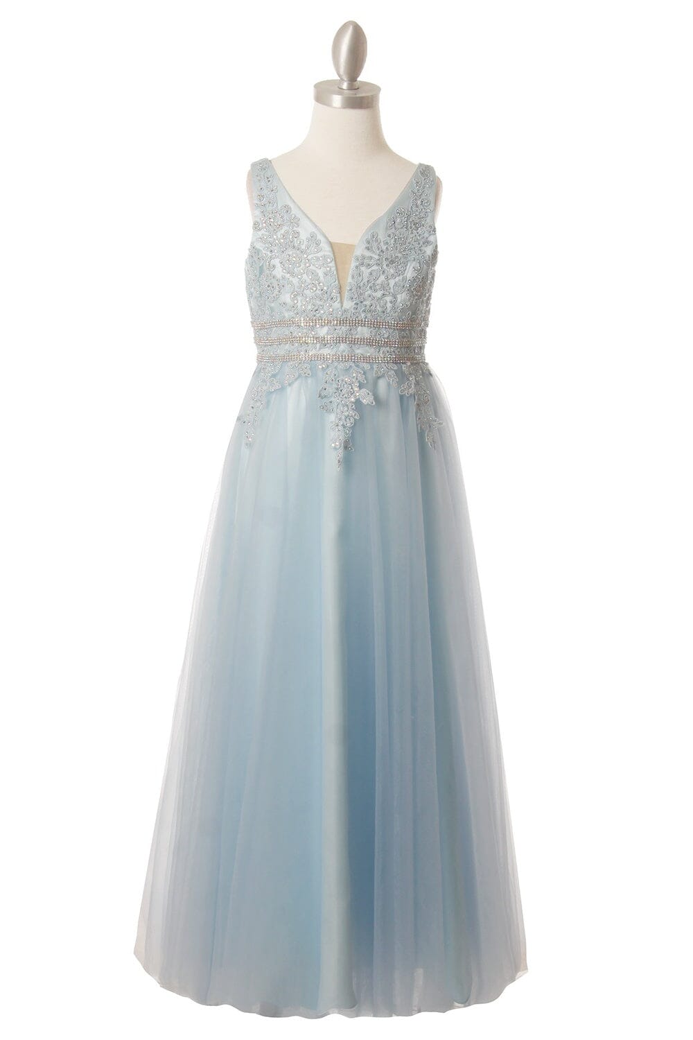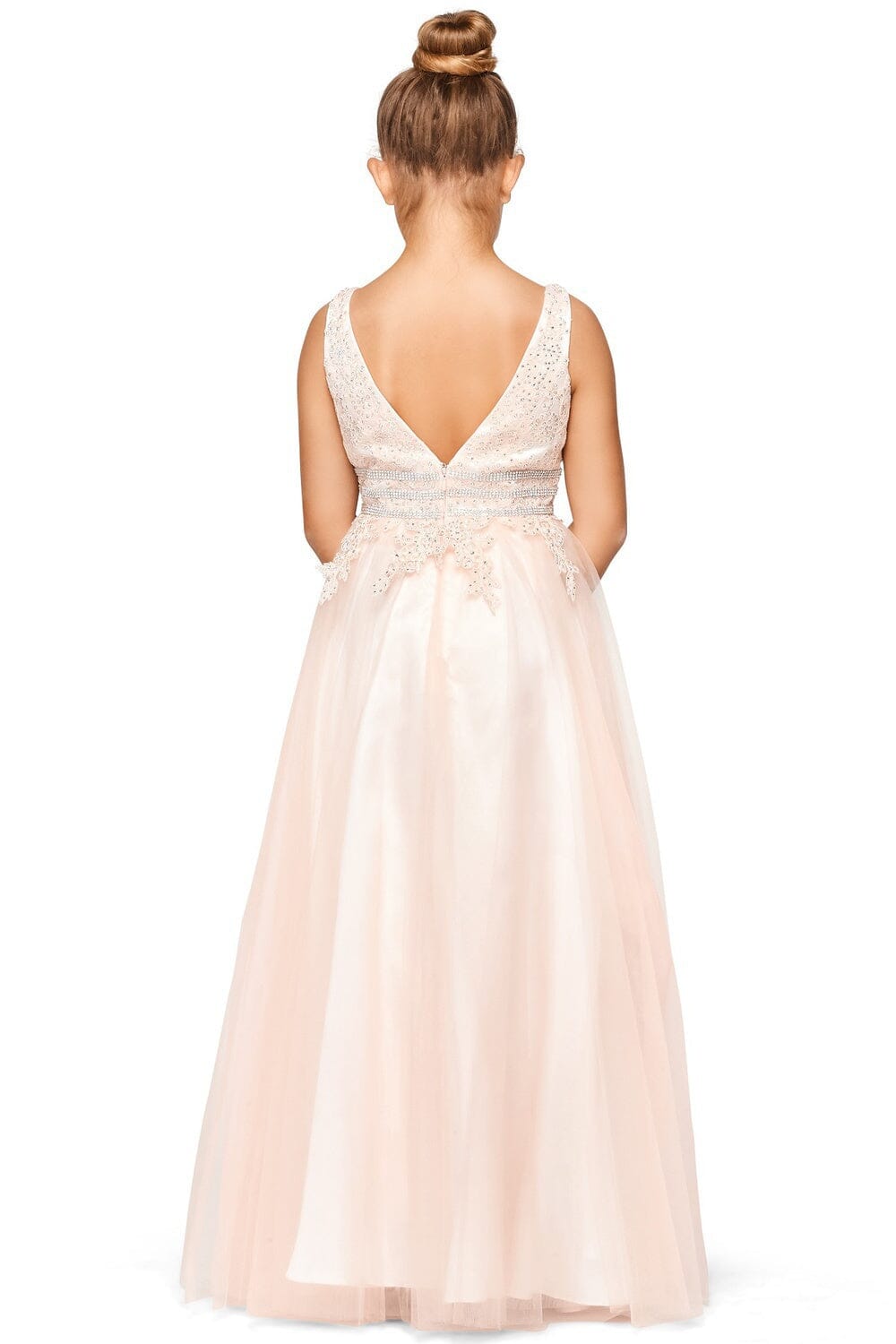 Your sweet girl will be the center of attention in this long sleeveless dress with beaded lace bodice by Cinderella Couture 5082. This elegant dress features a V-neck bodice secured with a sheer inset panel, lace appliques accented with sparkly AB rhinestones, beaded waistbands, open V-back, long A-line tulle skirt, and a zipper closure.