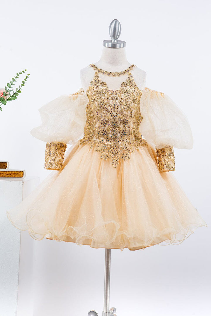 Your sweet girl will captivate the room in this lace applique short puff sleeve dress with A-line ruffled skirt by Cinderella Couture 5113. This short party dress features an illusion halter bodice, detachable puff sleeves, an open lace-up corset back, and a short A-line skirt with a curly hemline.