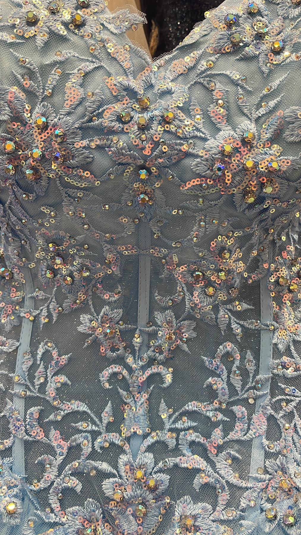 - Fabric: Glitter Tulle, Lace Appliques, Beaded Embellishments, Embroidery, Polyester