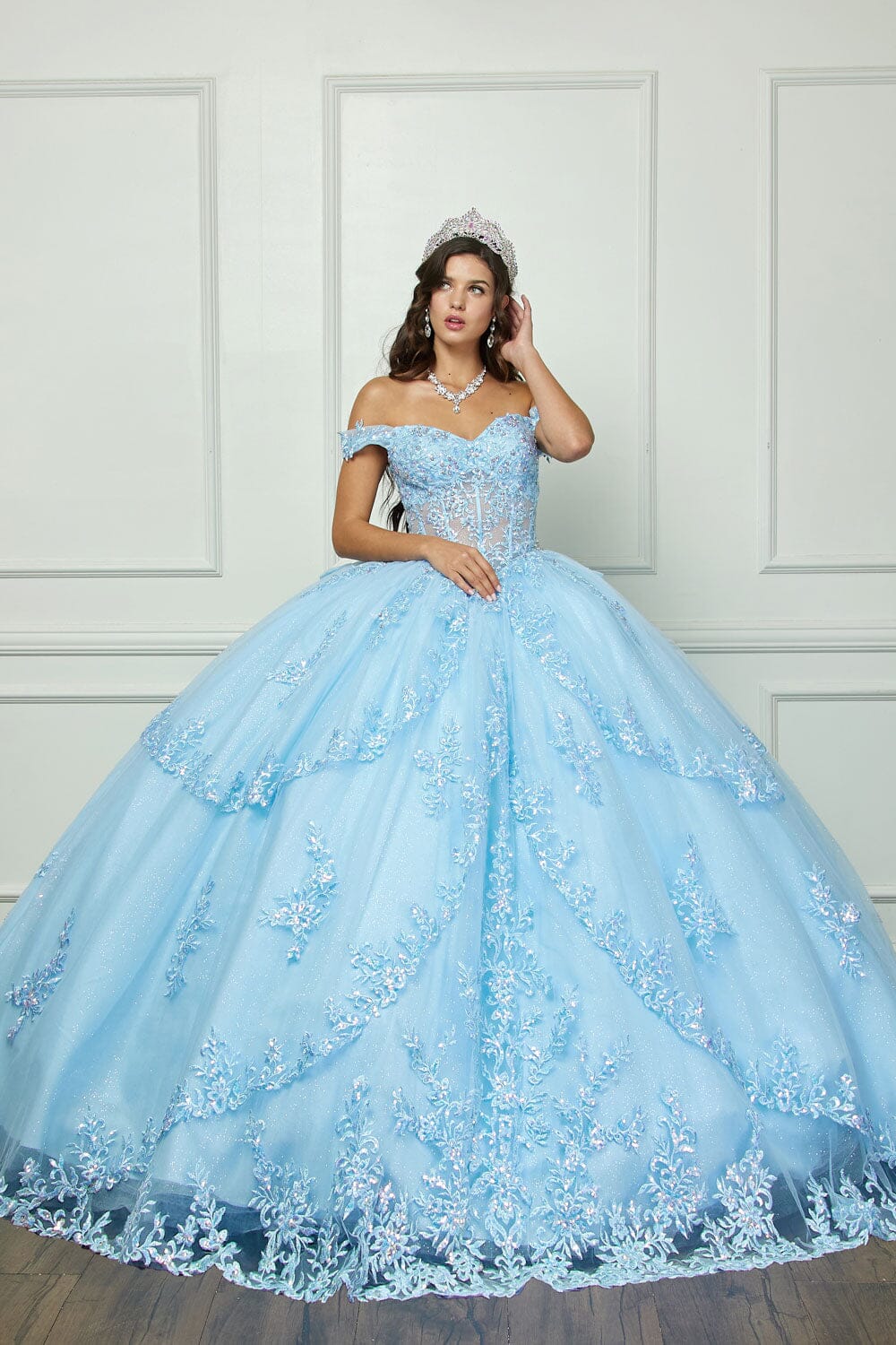 Make a statement in this embroidered lace applique long off the shoulder corset dress with A-line tiered skirt by Petite Adele PQ1060. This breathtaking ball gown features iridescent sequins that dance with the light, a multi-tiered illusion skirt that floats around you like a cloud, and enough glitter to light up the night. This dress boasts a romantic off-the-shoulder neckline and a sweetheart cut that flatters every figure. Embroidery and sparkling rhinestones adorn the bodice, adding a touch of luxury. The detachable bow lets you personalize your look.
