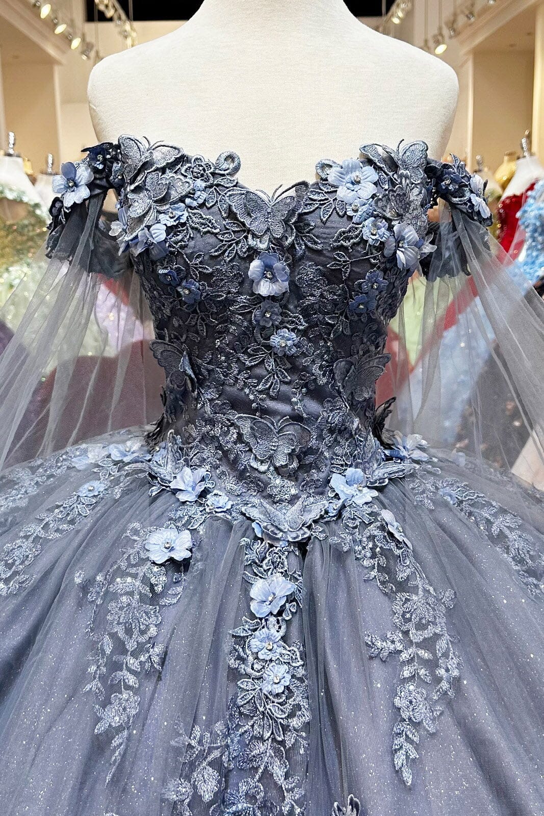 - Fabric: Mesh, 3D Butterfly Appliques, Floral Appliques, Beads, Glitter, Beaded Jewels, Sequins, 100% Polyester