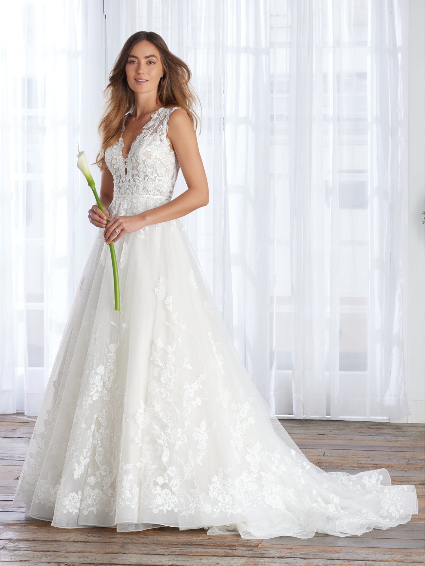 Look breathtaking in this lace V-neck with detachable long sleeves and high back of sheer lace illusion. Floral laces shower throughout this voluminous skirt of lace and tulle and accent the natural waist with a thin narrow belt.