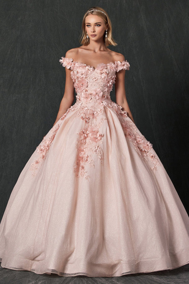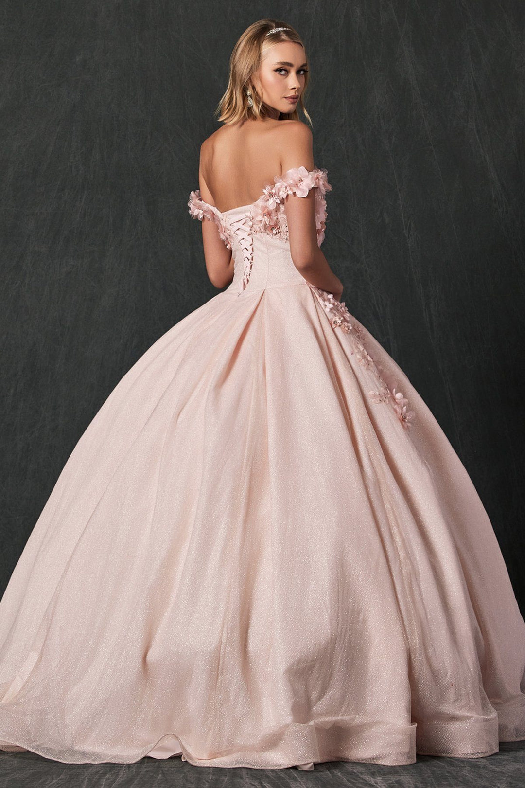 - 3D Floral Off Shoulder Glitter Ball Gown by Juliet