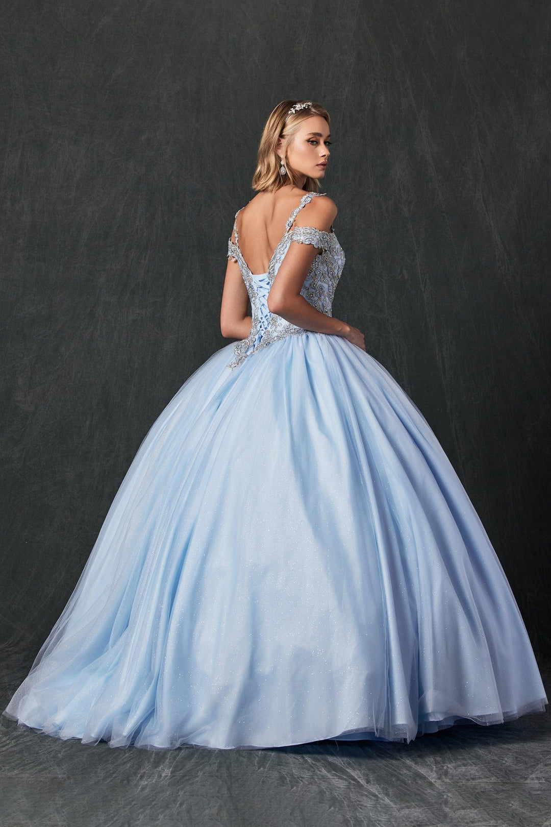Make a statement in this embroidered long cold shoulder dress with A-line glitter skirt by Juliet 1430. This beautiful ballgown features a cold shoulder sweetheart bodice, open lace-up corset back, and a full length A-line skirt that ends in a sweep train.